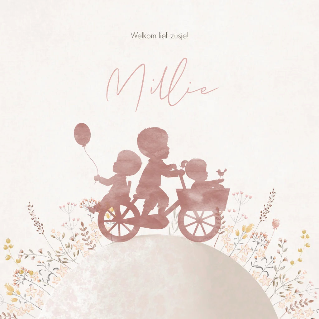 Dit mooie geboortekaartje voor een derde kindje. Drie kindjes op de fiets, een waterverf silhouet op een wereldbol vol kleine gekleurde bloemetjes. Pas het ontwerp eenvoudig aan naar eigen wens in onze online editor.