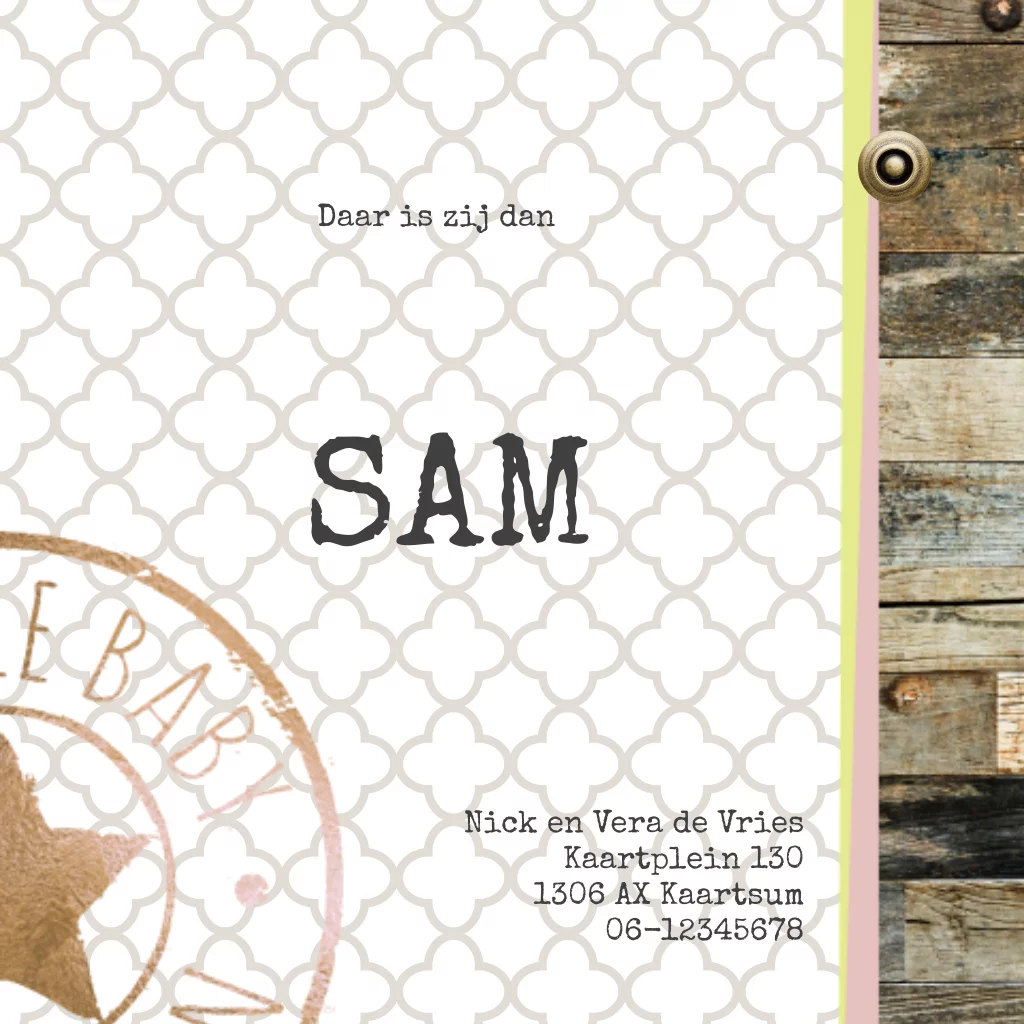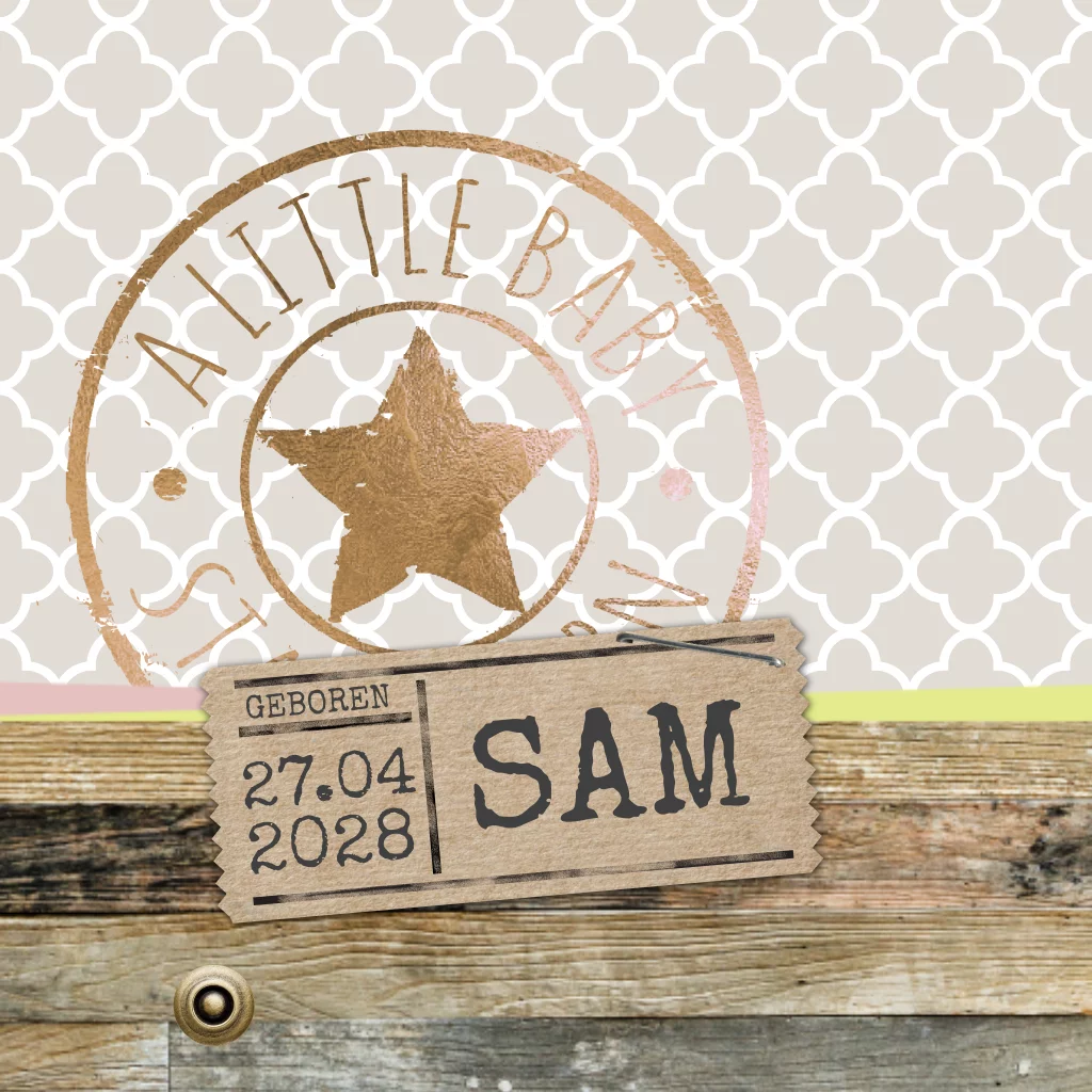 Geboortekaartje stoer voor een meisje met steigerhout patroon en goud look stempel.
