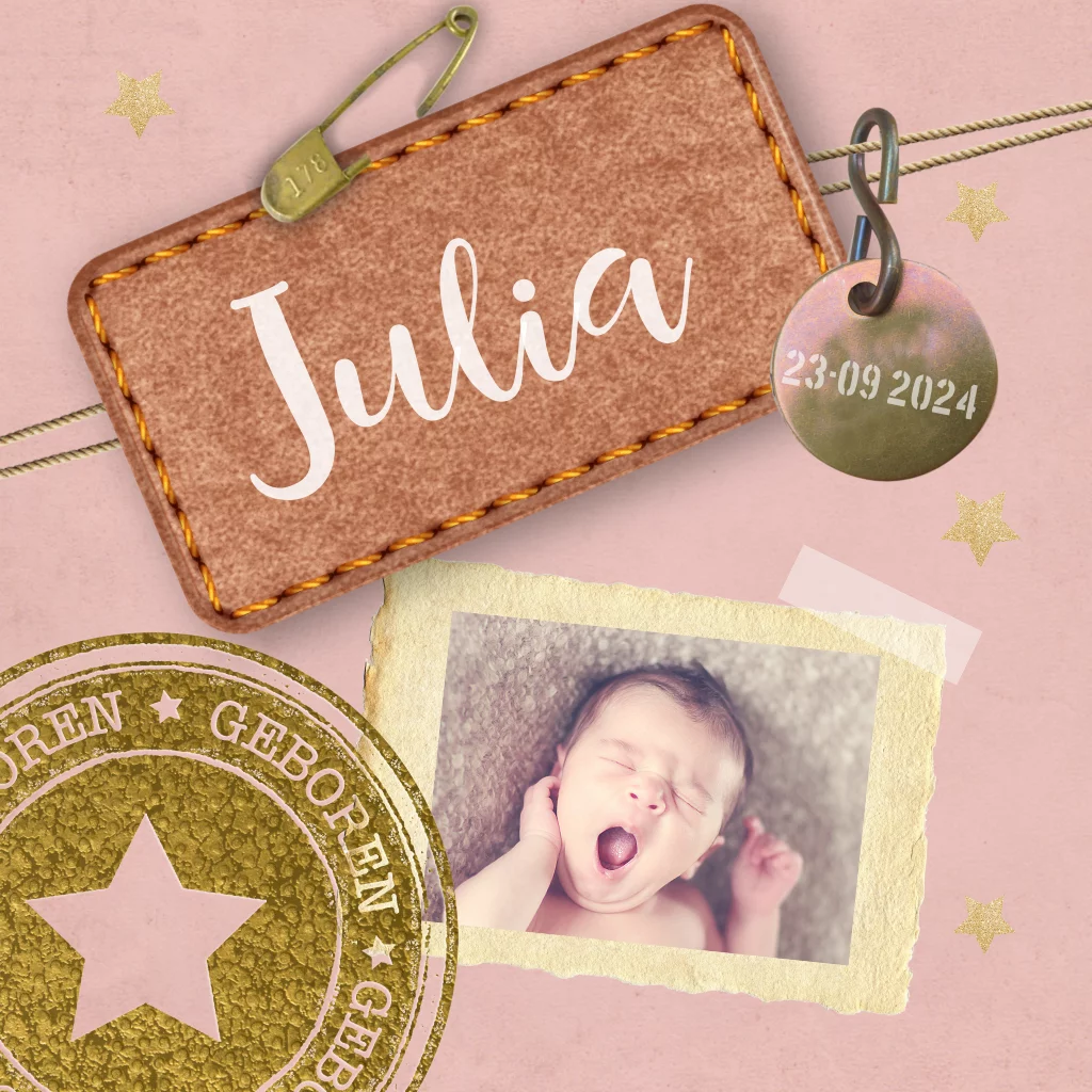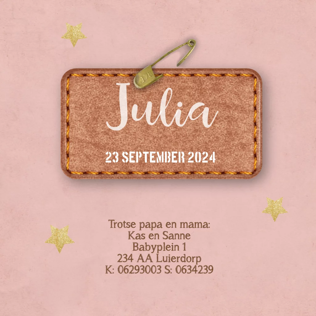 Maak dit stoere geboortekaartje voor jullie stoere meid. met leuke labels en gouden sterren. (145)