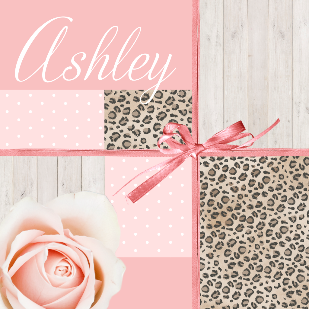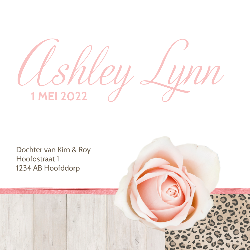 Geboortekaartje met hip panterprintje en rozen. Het ziet er lief uit. De leuke combinatie van hout, panterstof, stippen en de roos komt goed tot zijn recht.
