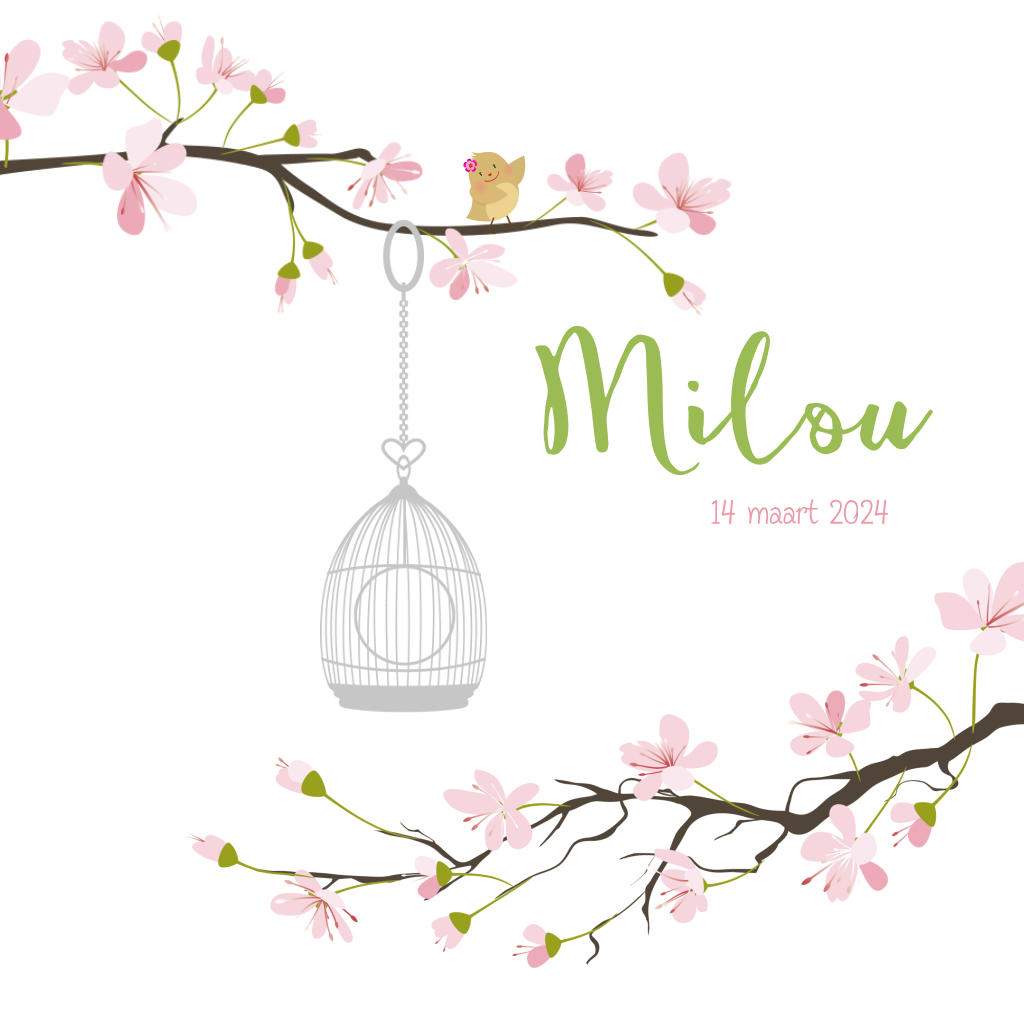 Lief geboortekaartje met takken, een vogelkooitje en een vogeltje. De vogelkooi en de vogeltjes kan je zelf verschuiven of van het kaartje weg halen. Ook de binnenkant ziet er chic uit.