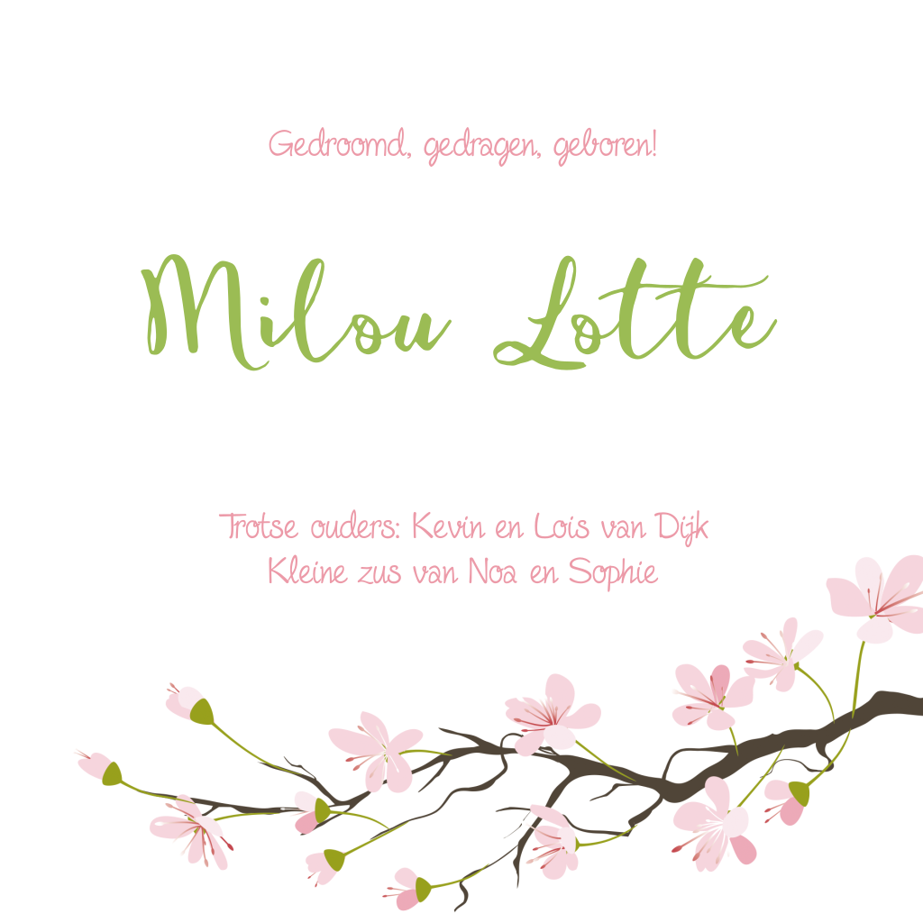Lief geboortekaartje met takken en bloesem voor een meisje