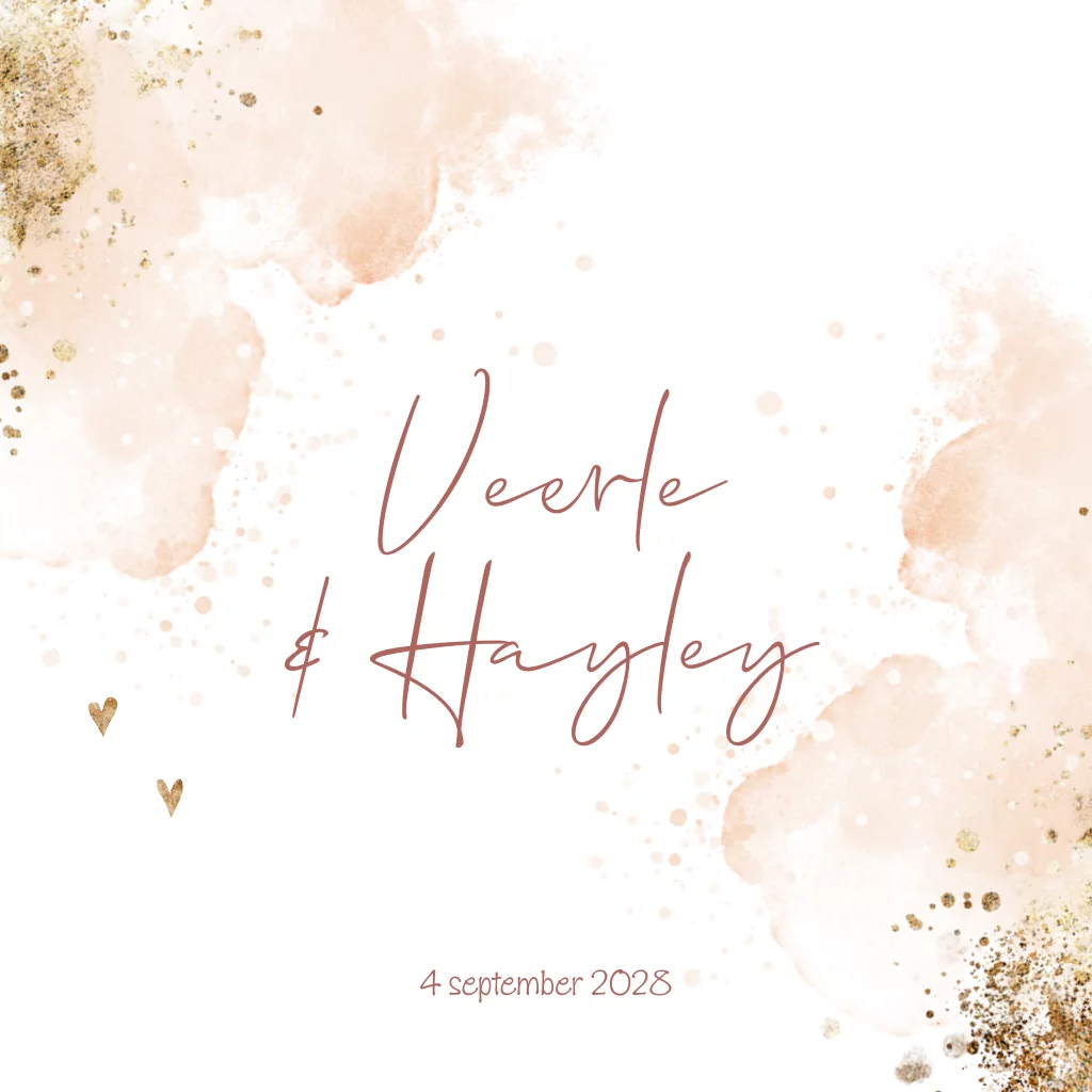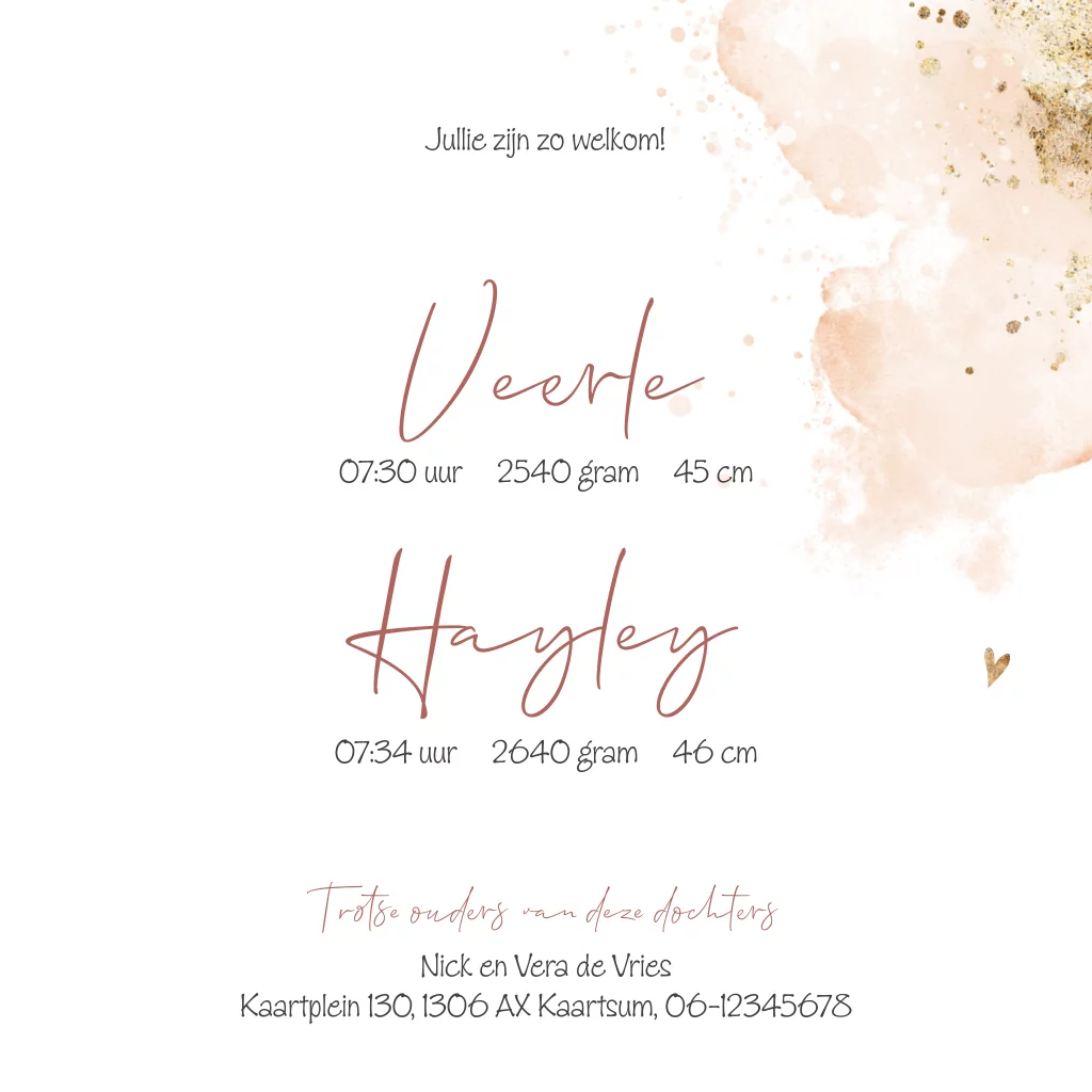Hip geboortekaartje tweeling zusjes met roze watercolor en goudlook spetters.
