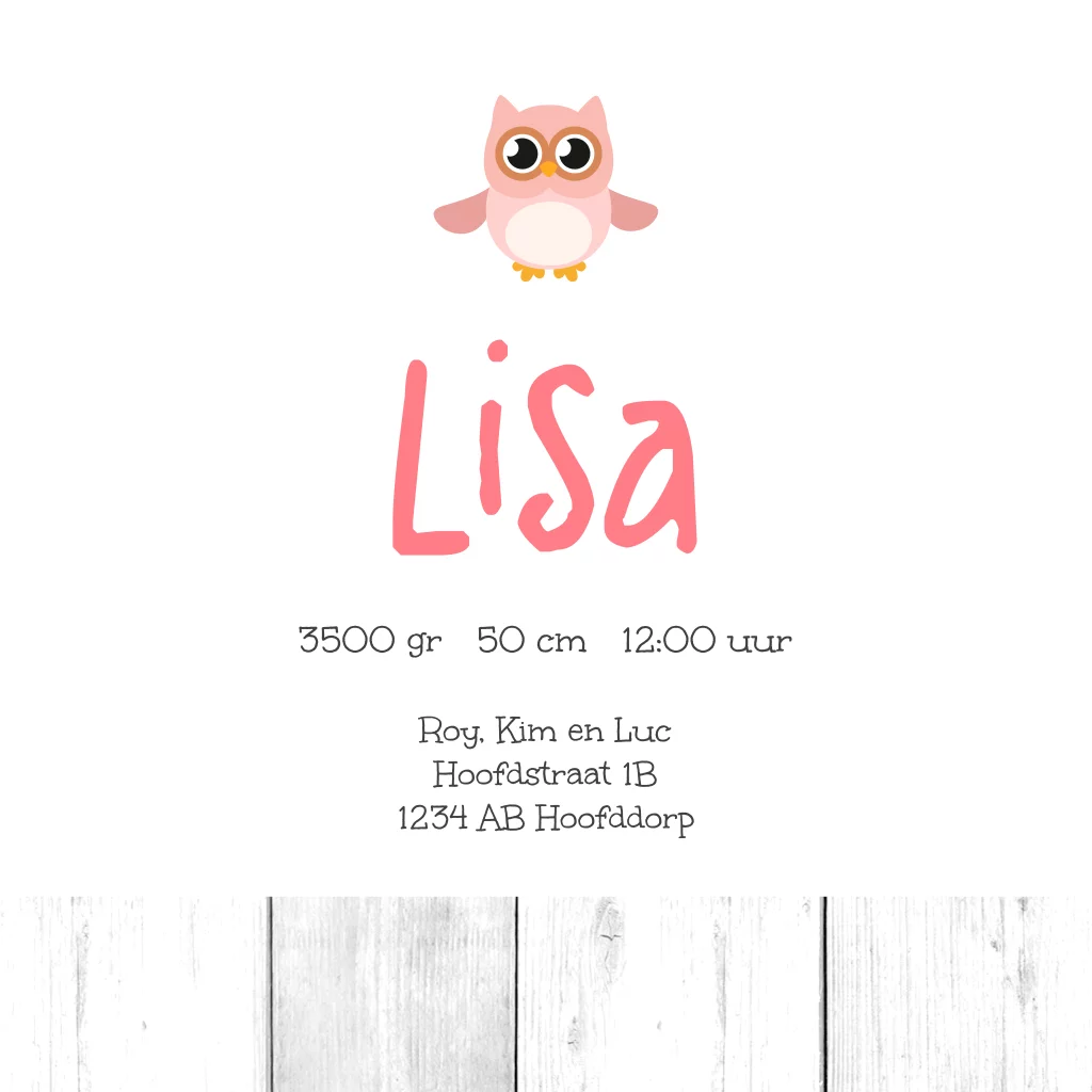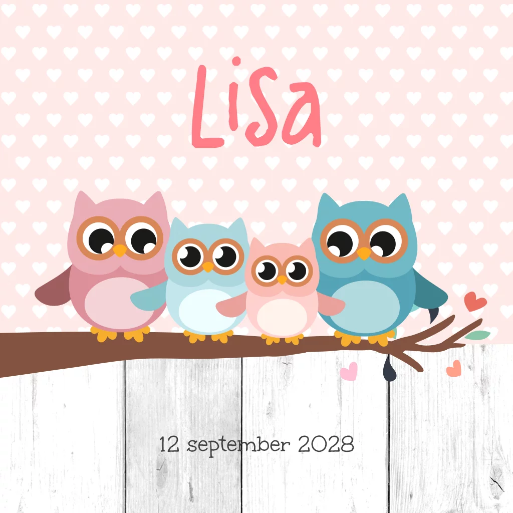 Uniek geboortekaartje zusje met uiltjes familie in een boom.De hartjes en zachte kleuren geven dit geboortekaartje een zachte uitstraling.