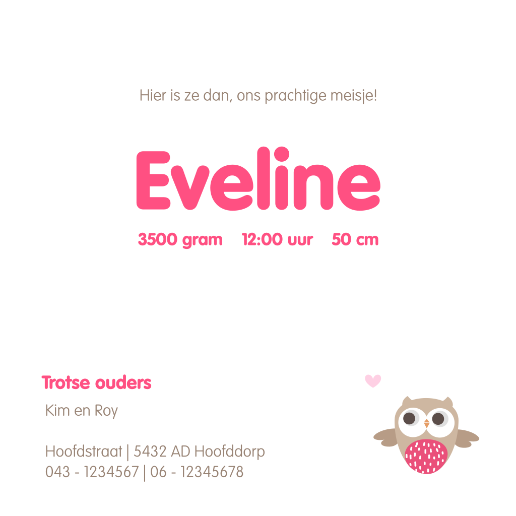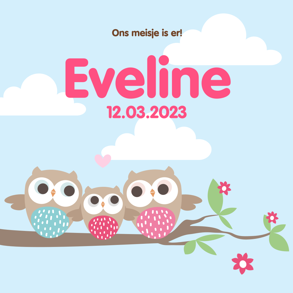 Geboortekaartje voor een meisje met familie uil. Dit babykaartje is versiert met wolken, drie uiltjes, een tak met bloemen en de wolken maken het helemaal af.