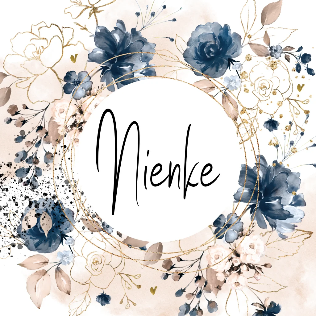 Geboortekaartje uniek voor een meisje met goud look en blauwe botanische bloemen.