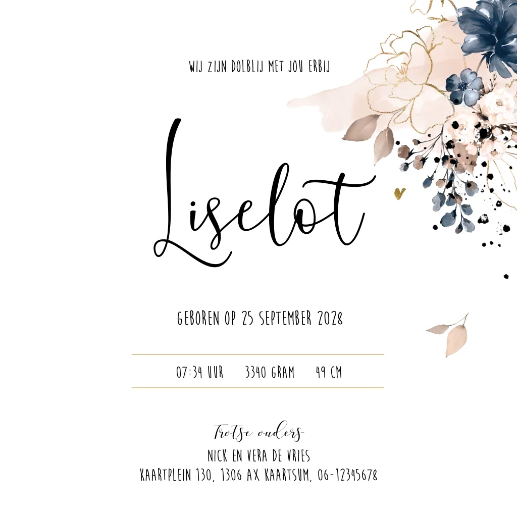 Uniek geboortekaartje meisje met bloemen en echt stikje