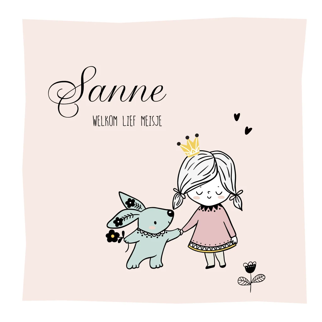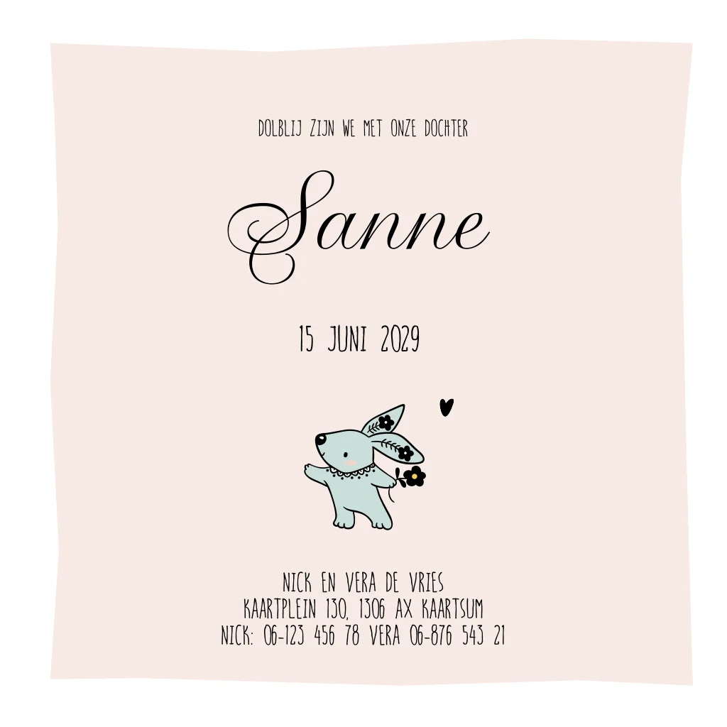 Lief en uniek geboortekaartje met een getekend zonnetje, kindje en konijntje.