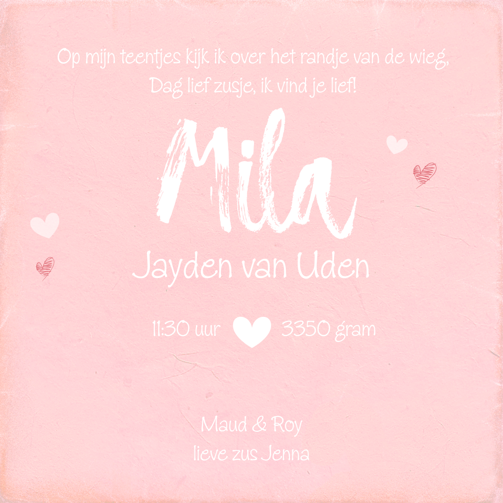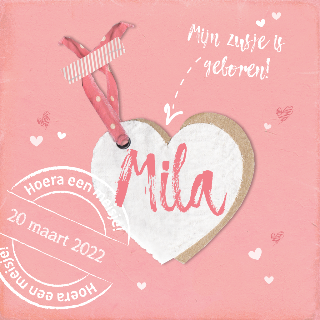 Krijgt jouw kind een zusje? Dan is dit kaartje met kraftlook echt geschikt. Natuurlijk kan je ook de tekst 'mijn zusje is geboren' vervangen door iets anders, zoals 'it's a girl'. Schrijf de naam van je baby op het hartjeslabel en pas de geboortedatum in het stempel aan.