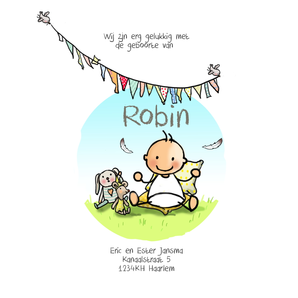Vrolijk geboortekaartje met een getekende tipi tent