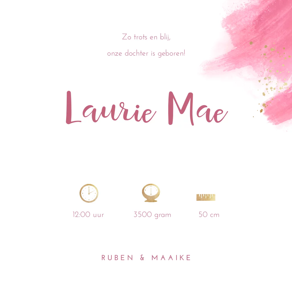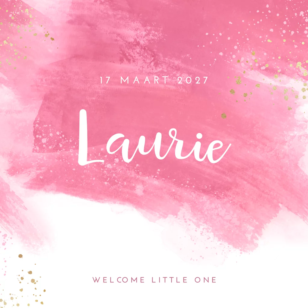 Waterverf geboortekaartje meisje roze met goudlook spetters