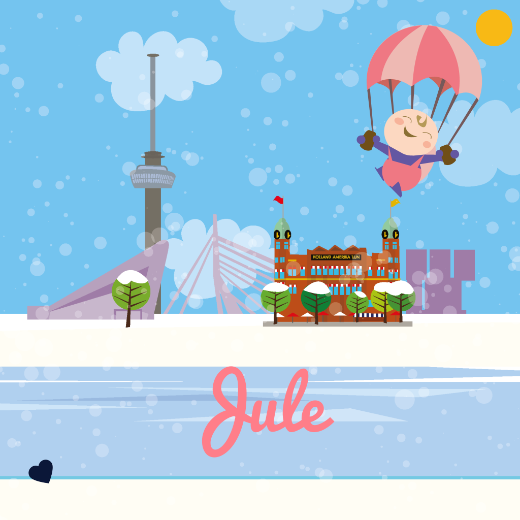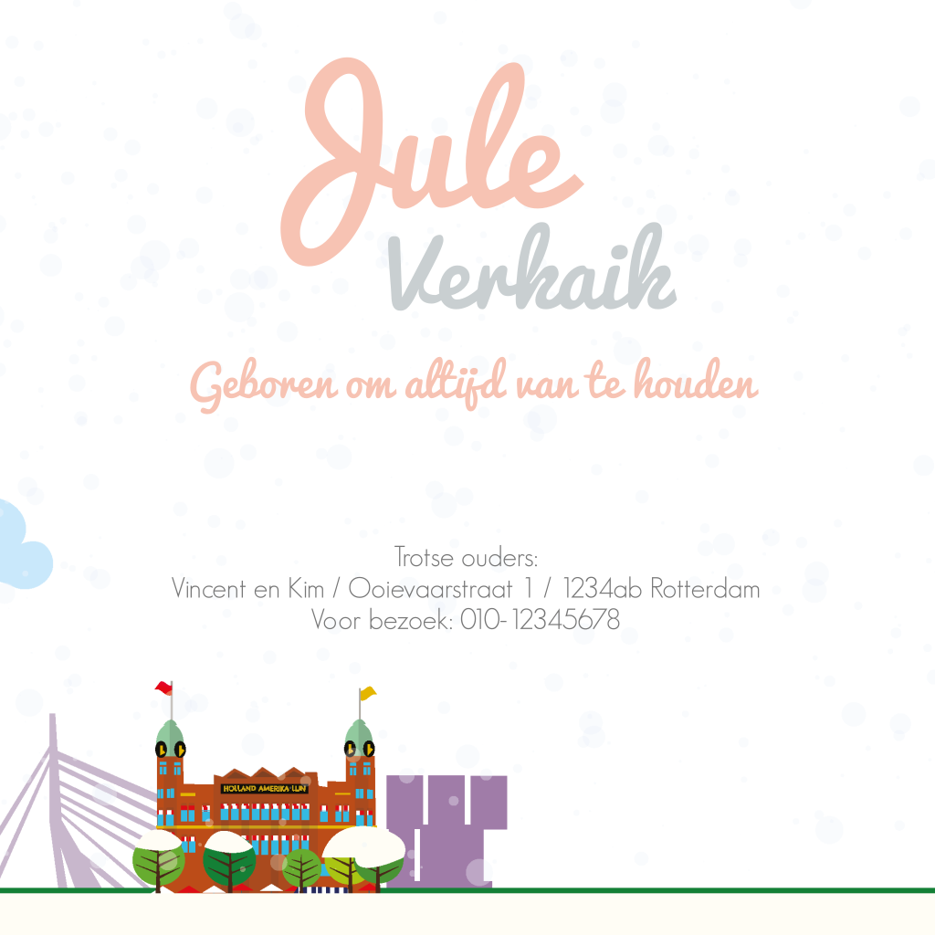 Vrolijke geboortekaartjes voor een kleine Rotterdammer, met de skyline van Rotterdam, waaronder de Euromast, hotel New York, erasmusbrug. (3227)