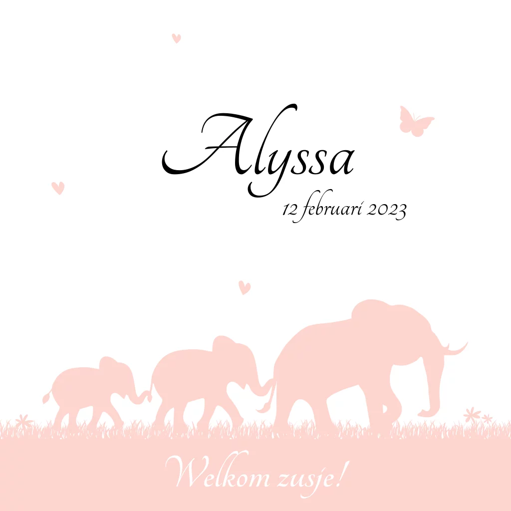 Hip geboortekaartje voor een meisje. De olifantjes kun je zo groot maken als je zelf wilt en ook nog eens omkleuren in onze editor. Tip: bestel dit kaartje op parelmoerpapier. In dit papier zit een mooie sprankeling waardoor jullie geboortekaartje echt tot leven komt.