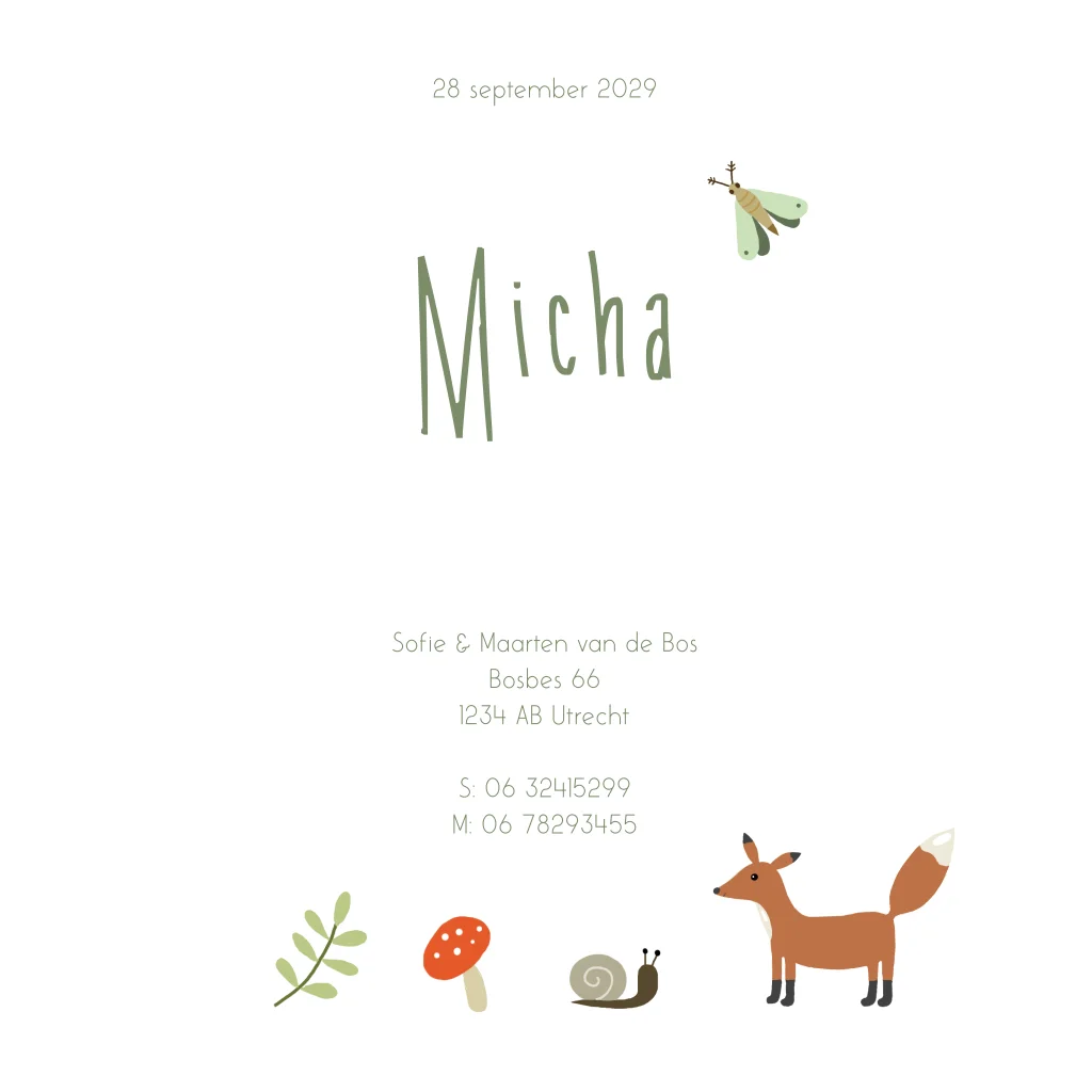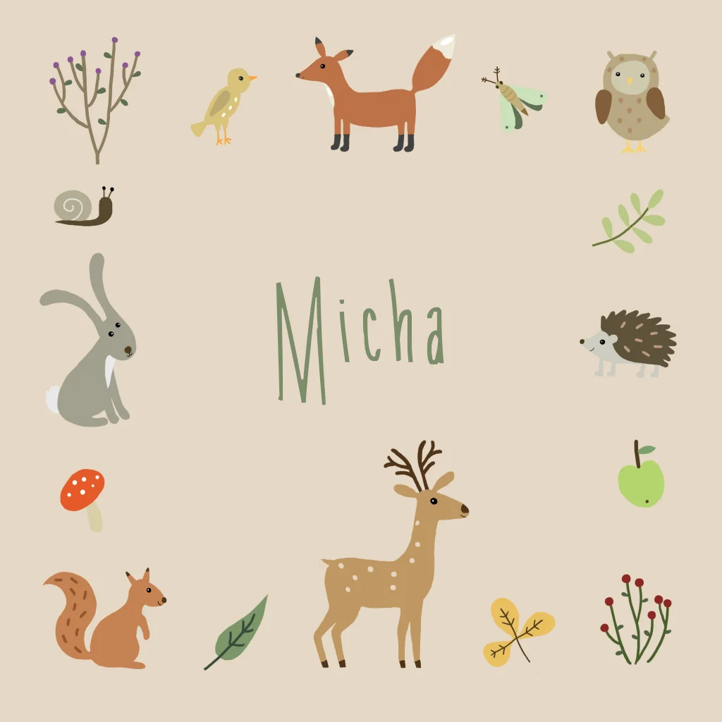 Een beige herfst geboortekaartje met bosdieren en natuur voor zowel een jongen als meisje. Bewerk naar wens in onze editor.