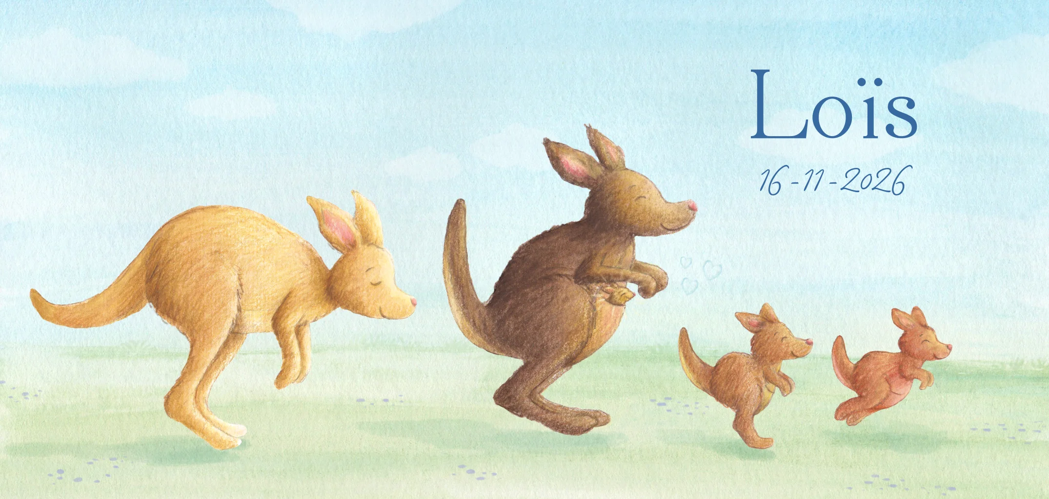 Neutraal geboortekaartje voor derde kindje, met illustratie van een vrolijke springende kangoeroe familie.