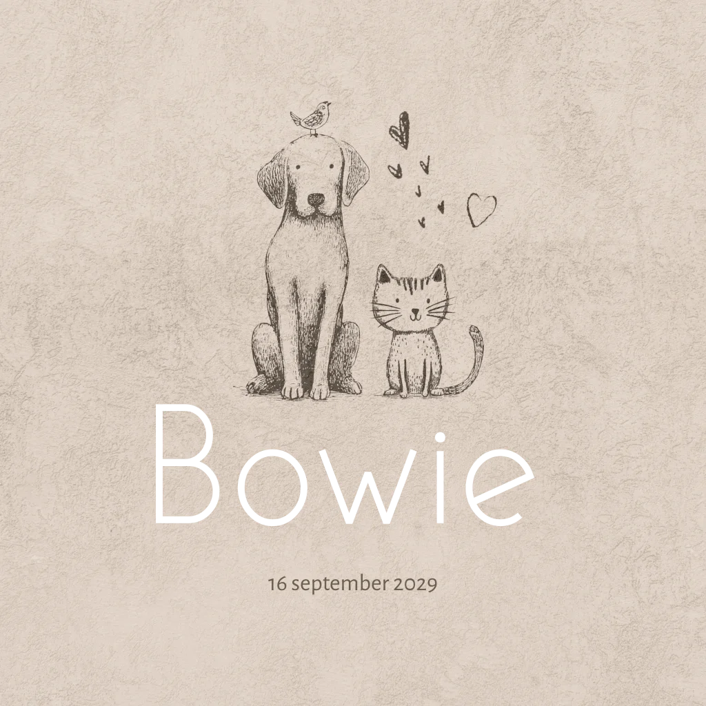 Een neutraal geboortekaartje met een tekening van een hond, kat en vogel in zachte bruine en grijstinten. Het ontwerp heeft een rustige uitstraling en kan eenvoudig naar eigen wens worden aangepast in onze online editor. Uit de speciale huisdieren collectie 'Thuis is met jou 🐾.