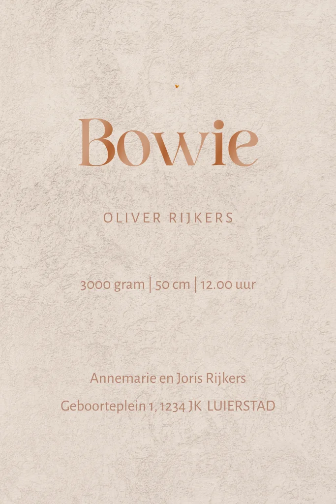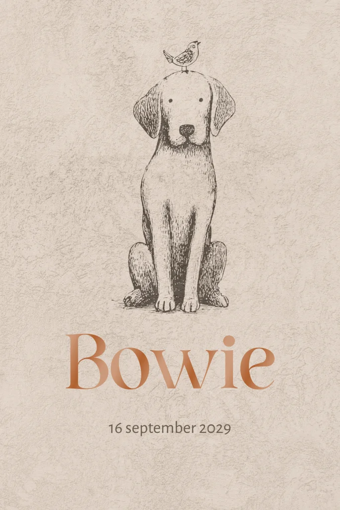 Een neutraal geboortekaartje met een tekening van een hond en een vogeltje in zachte beige tinten. Het ontwerp heeft een rustige en tijdloze uitstraling en kan eenvoudig naar eigen wens worden aangepast in onze online editor. Uit de speciale huisdieren collectie 'Thuis is met jou 🐾.