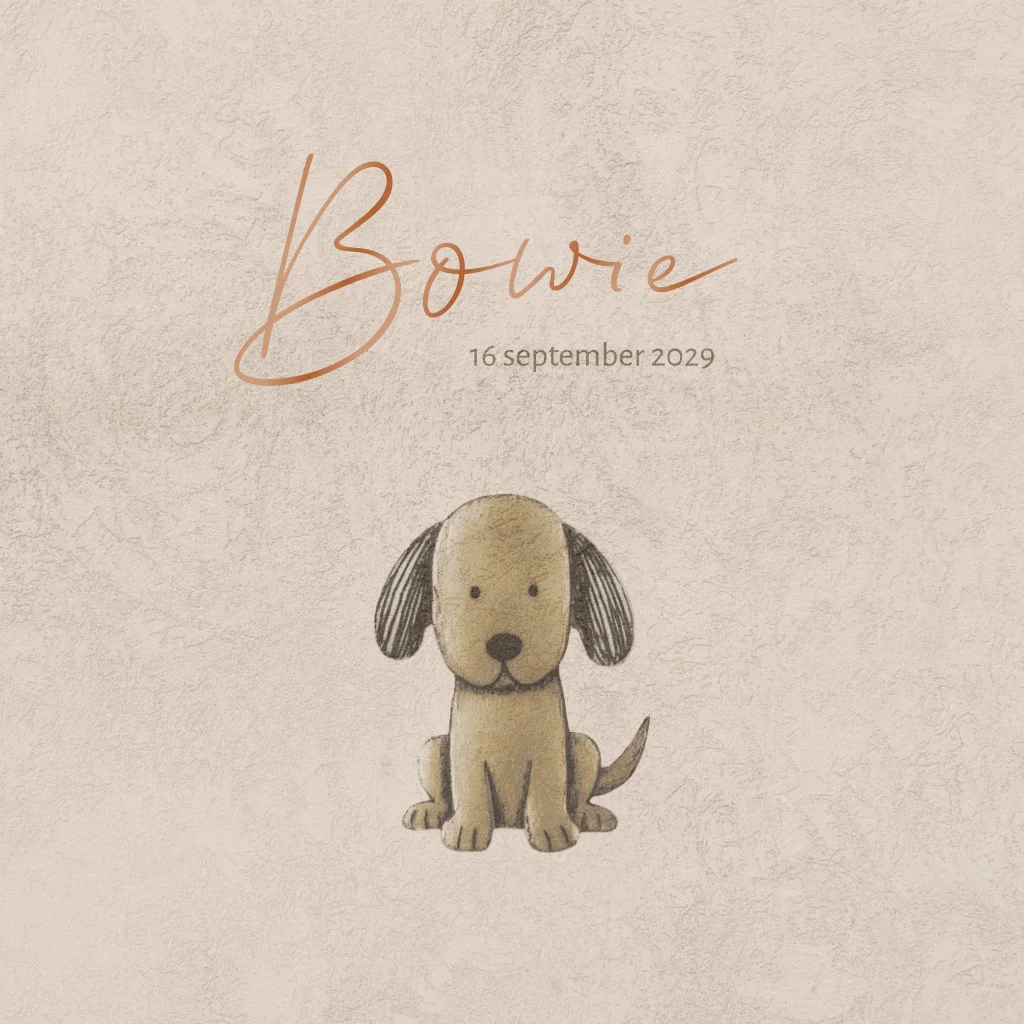 Een neutraal geboortekaartje met een tekening van een hondje in zachte beige tinten. Het ontwerp heeft een rustige en tijdloze uitstraling en kan eenvoudig naar eigen wens worden aangepast in onze online editor. Uit de speciale huisdieren collectie 'Thuis is met jou 🐾.