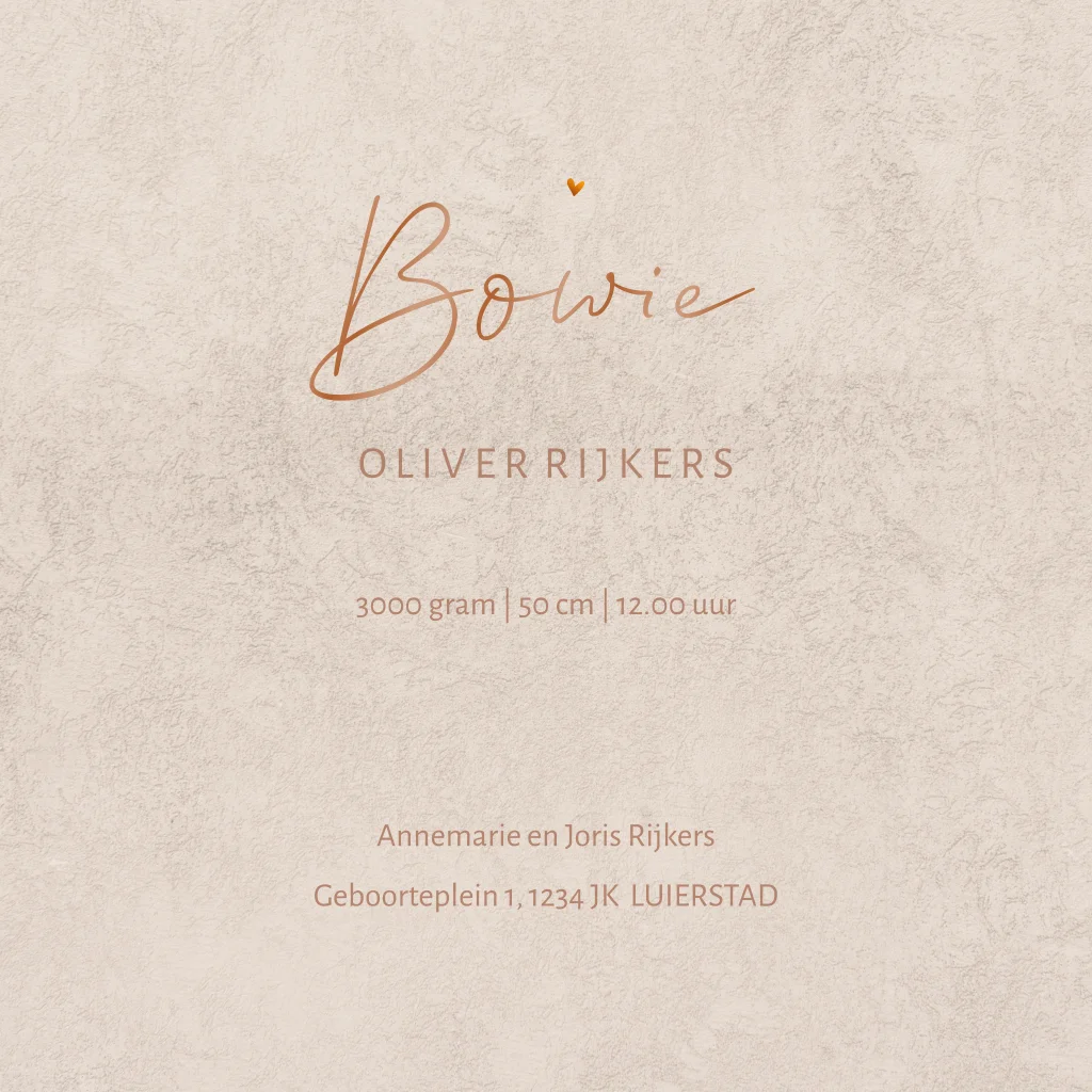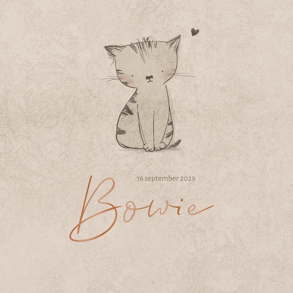 Een neutraal geboortekaartje met een zachte illustratie van een kat in beige tinten. Het ontwerp heeft een tijdloze en rustige uitstraling en kan eenvoudig naar eigen wens worden aangepast in onze online editor. Uit de speciale huisdieren collectie 'Thuis is met jou 🐾.
