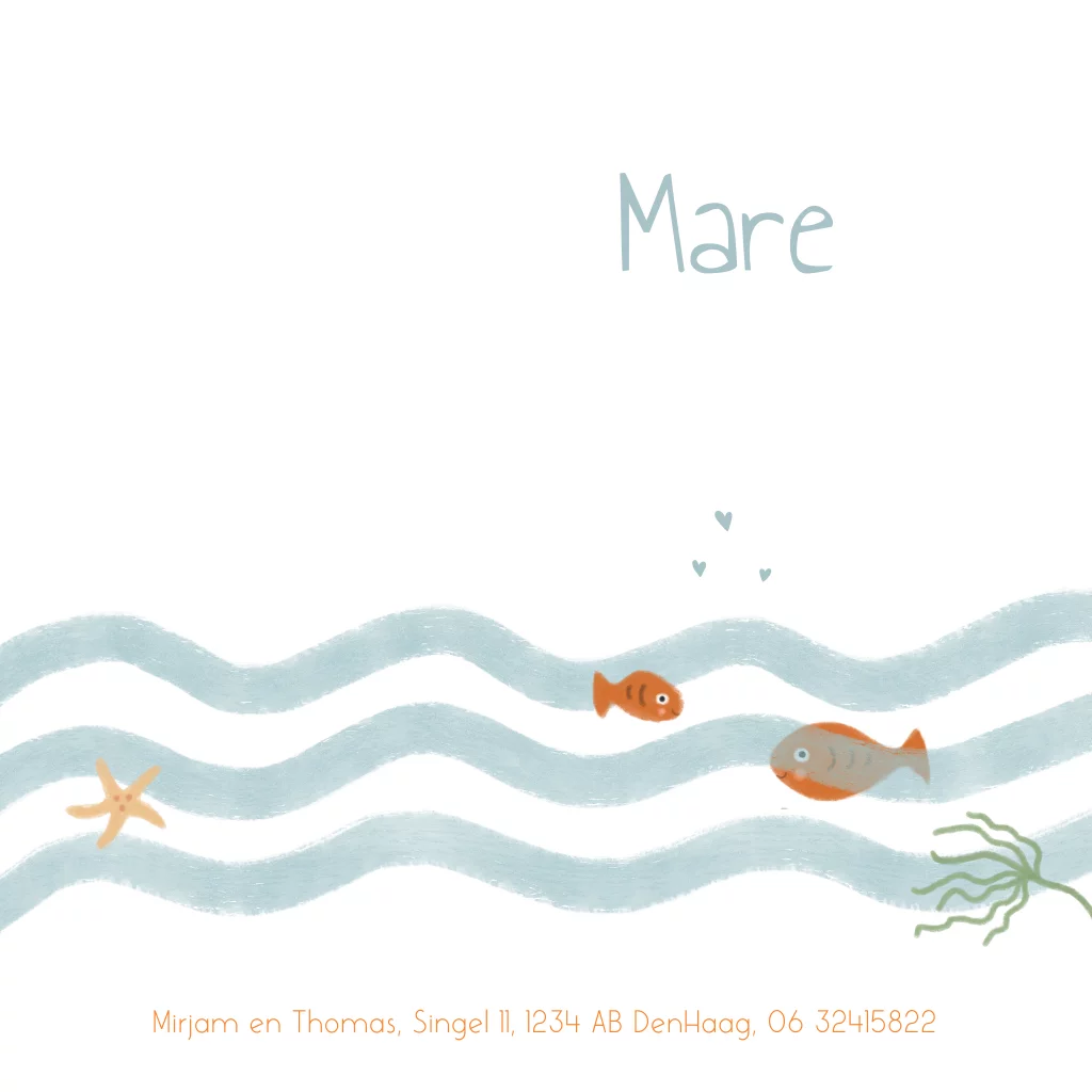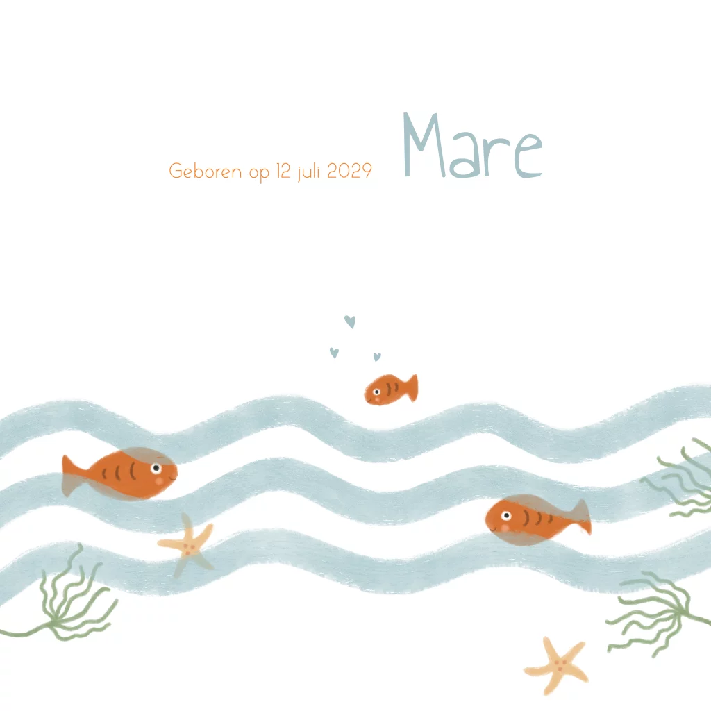 Een fris, modern en zomers geboortekaartje voor een jongen of meisje met goudvissen, zeesterren en wier in de zee