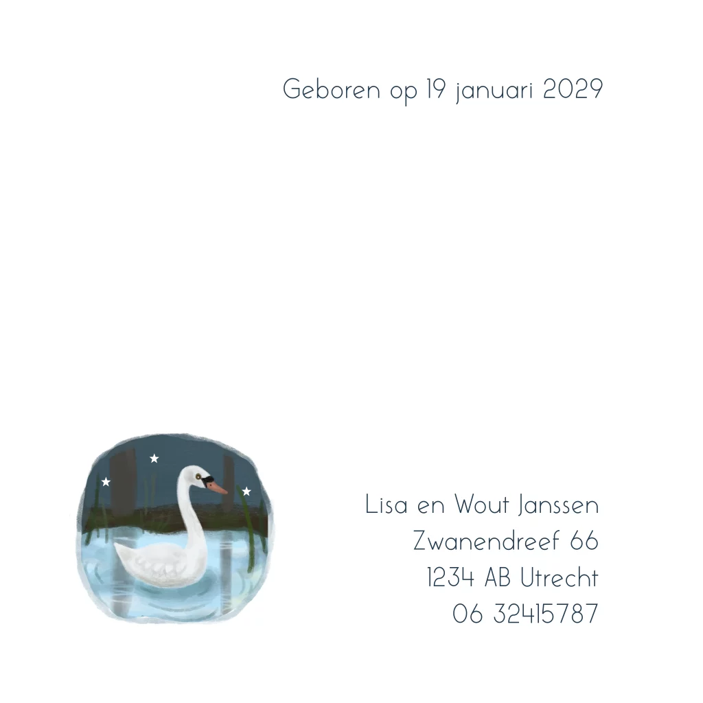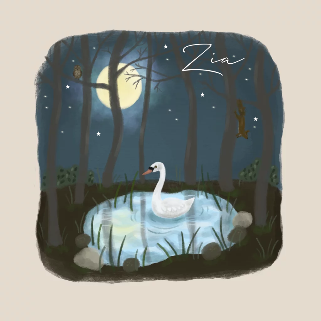 Een sprookjesachtig winter geboortekaartje met zwaan in een meertje. In het bos met volle maan staan een uil in een boom en een eekhoorn afgebeeld. De goudfolie in e naam en sterren zorgt voor een extra feestelijk effect