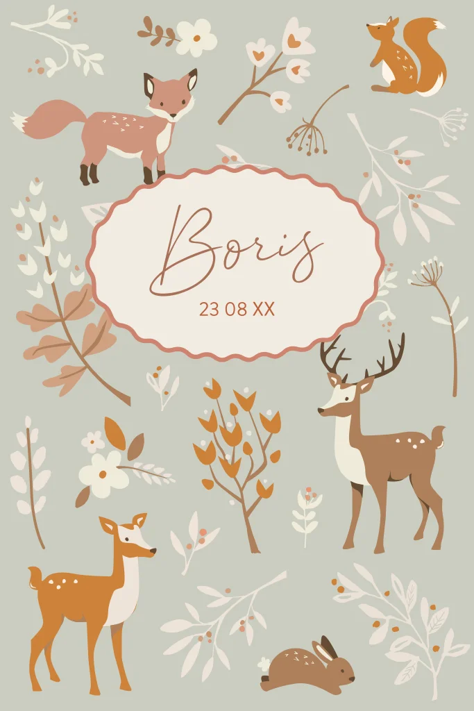Een unisex geboortekaartje met dessin met bosdieren hert vos eekhoorn
