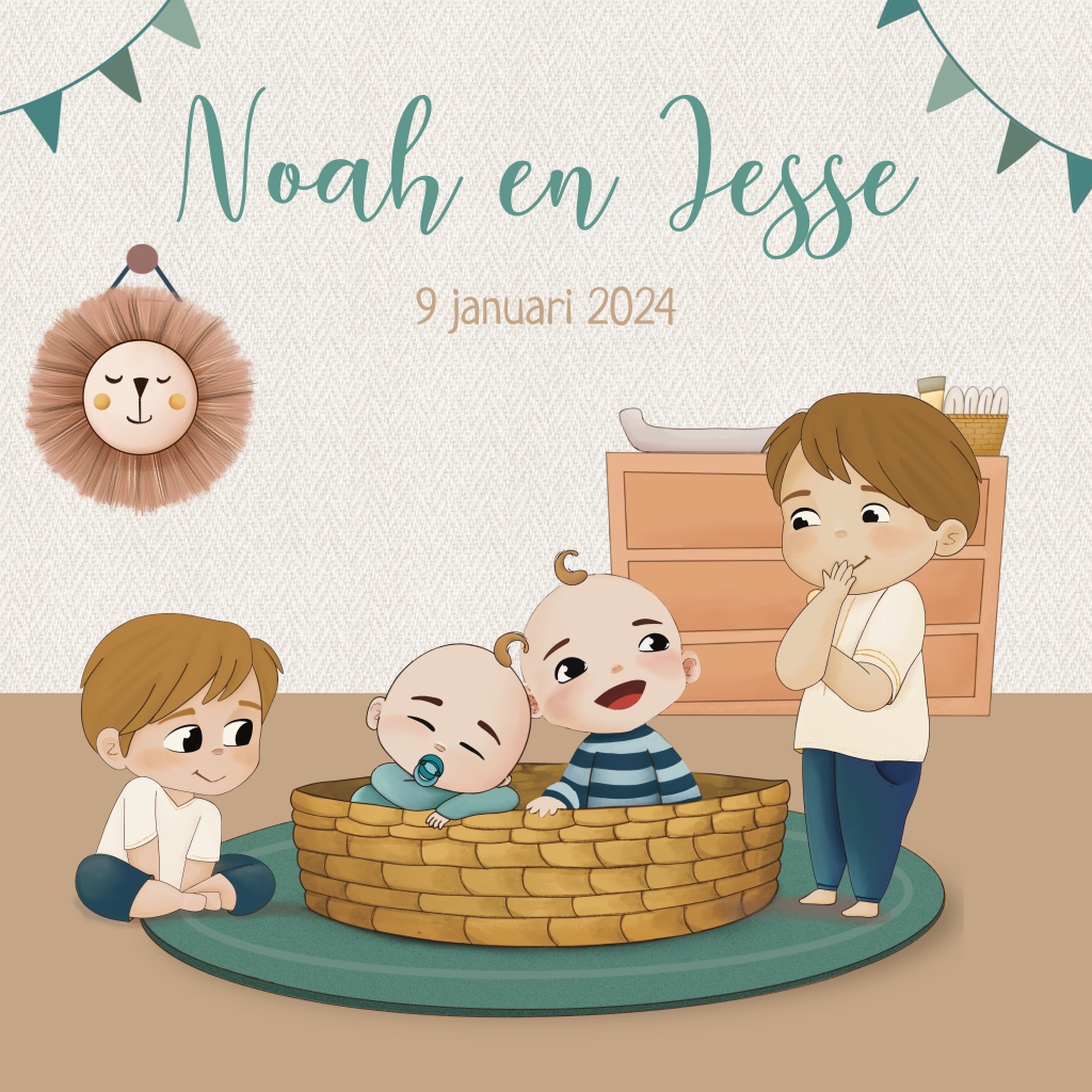 Getekend geboortekaartje met jongens tweeling en 2 grote broers. Kinderkamer en rieten mand. (4310)