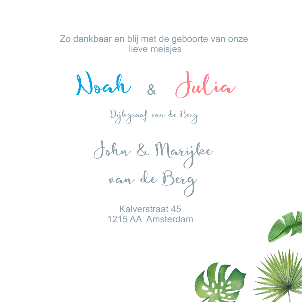 Geboortekaartje met lieve kleine leeuwtjes op tropisch blad voor een tweeling jongen meisje. (3076)