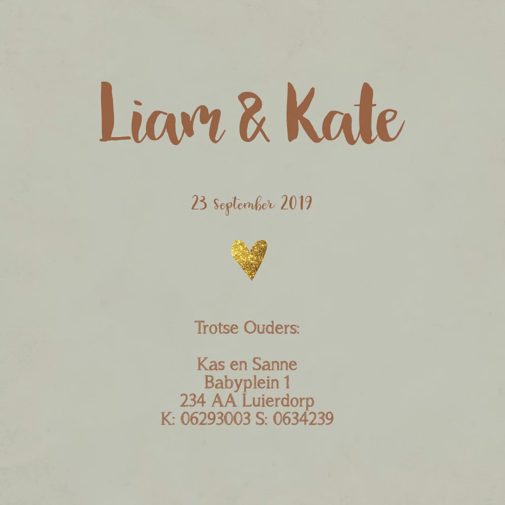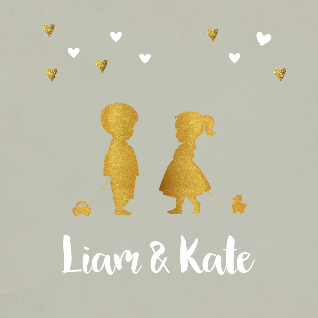Maak deze nostalgische geboortekaart voor jullie mooie tweeling met lieve gouden hartjes en gouden silhouette. (148)
