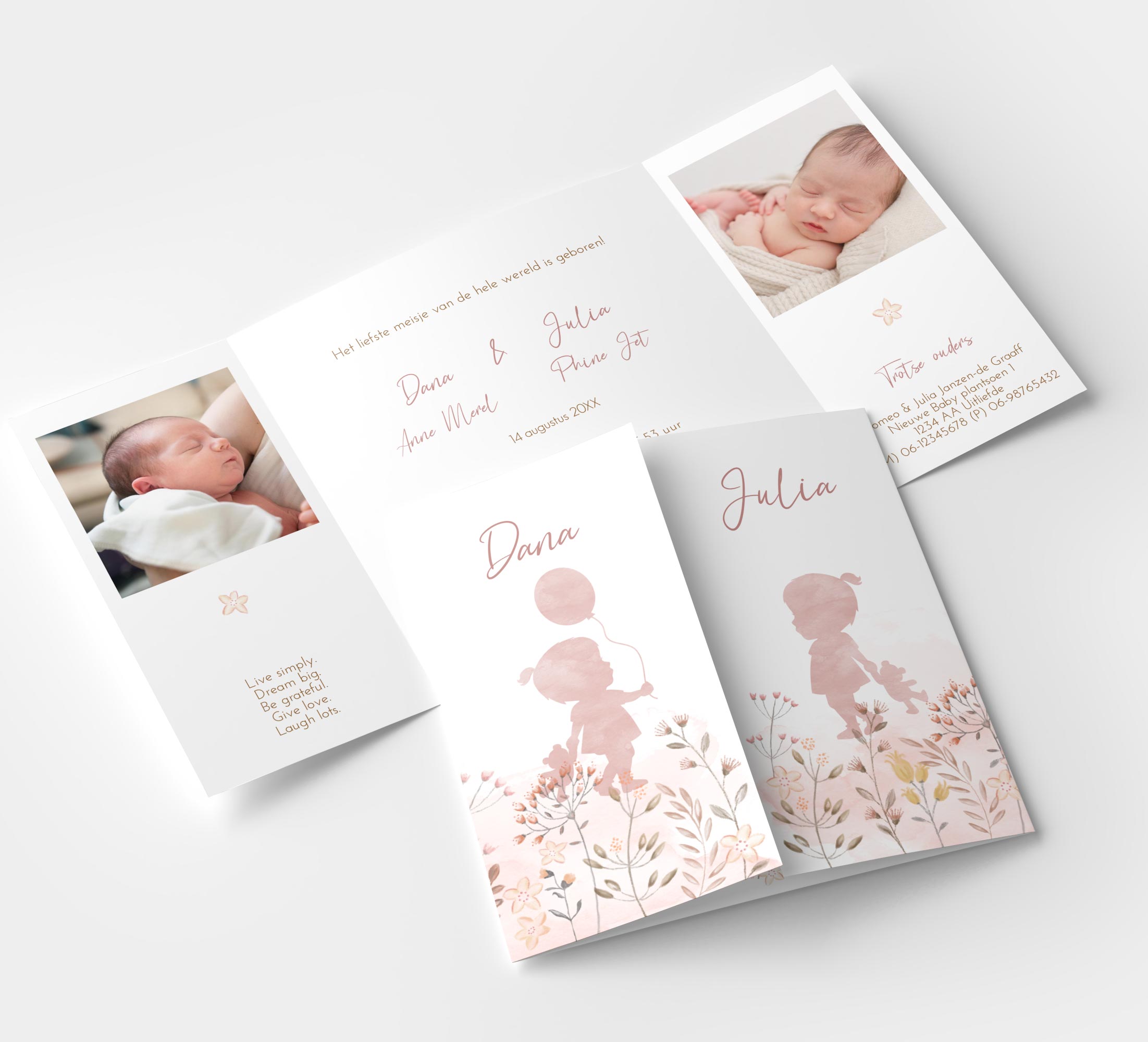 Theatervouw geboortekaartje voor meisjestweeling met silhouet en bloemen