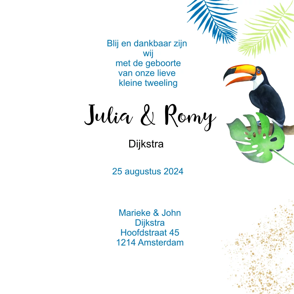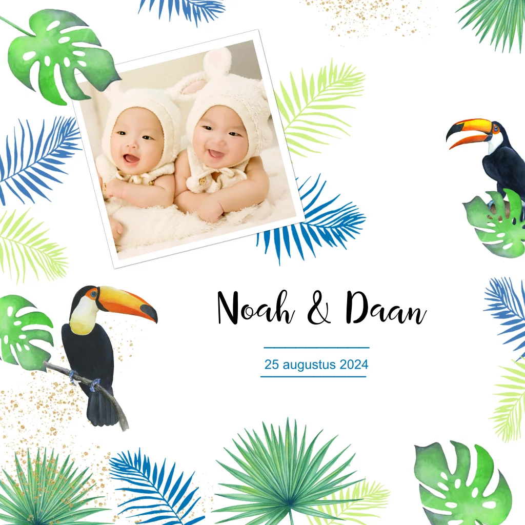 Geboortekaartje voor een jongetjes tweeling met leuke toekan vogels en tropische bladeren. (3037)