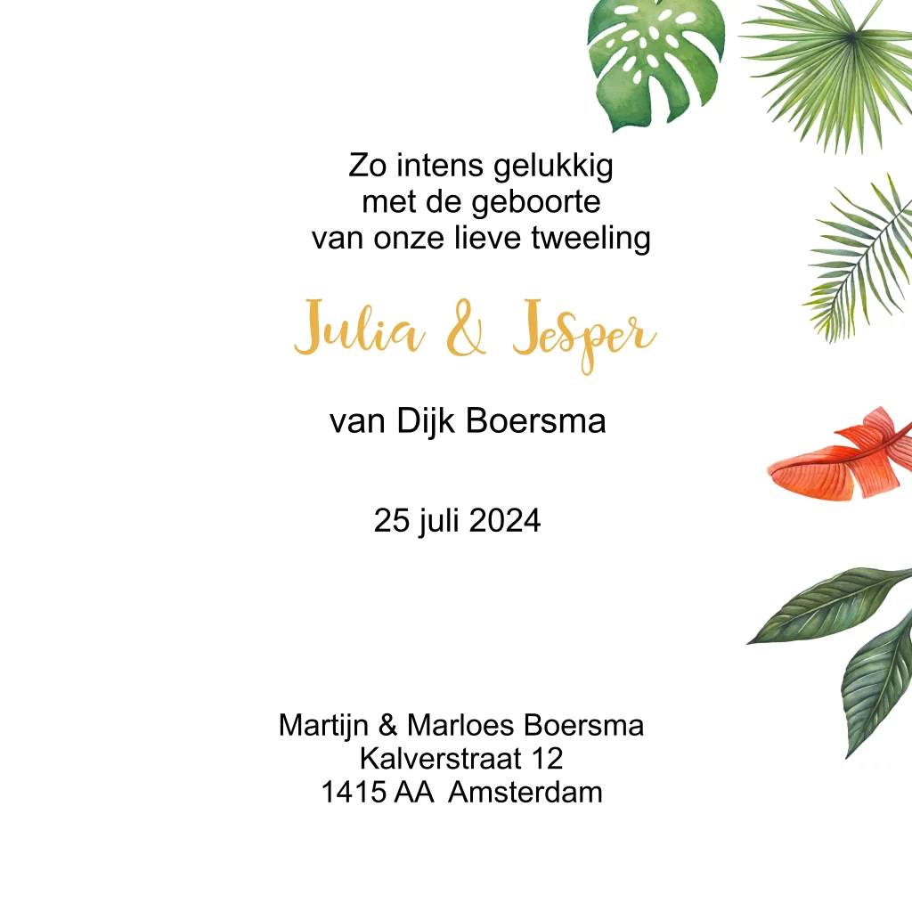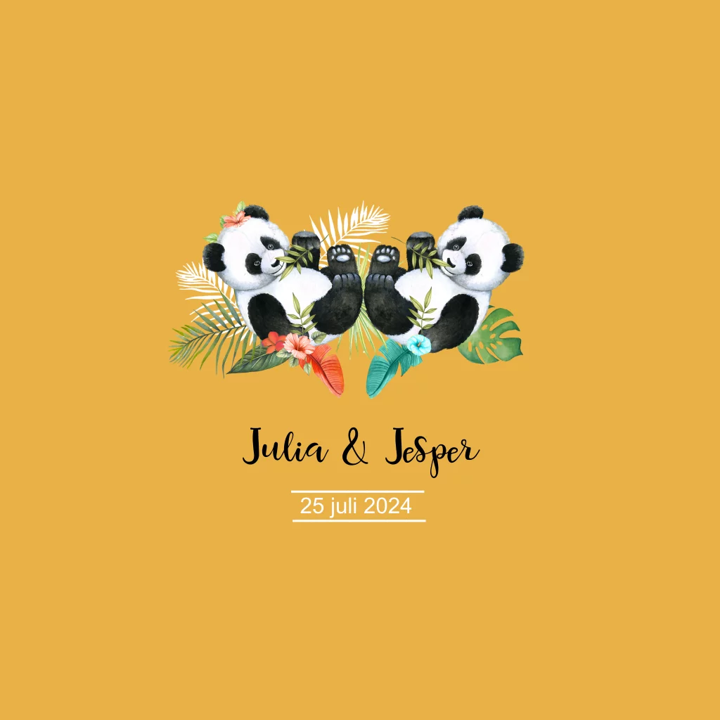 Geboortekaartje voor een tweeling meisje en jongen met lieve pandabeertje op tropisch blad en bloemen. (3028)
