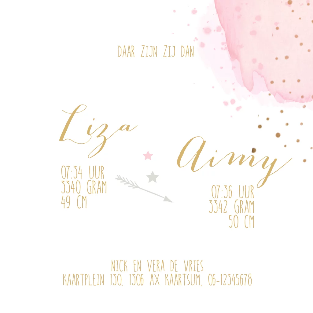 Geboortekaartje hip meisje tweeling met roze waterverf hartjes en stipjes.