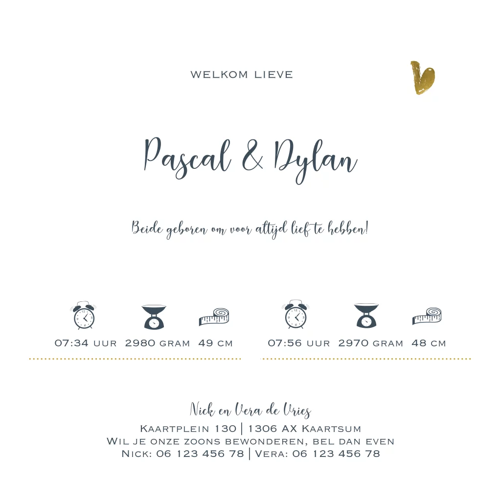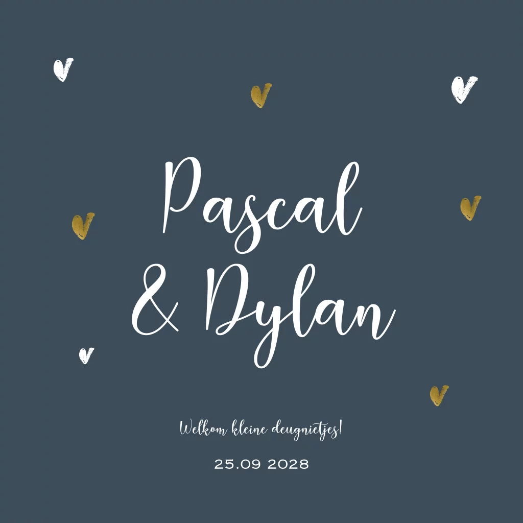 Hip geboortekaartje donkerblauw met hartjes voor een jongetjes tweeling.
