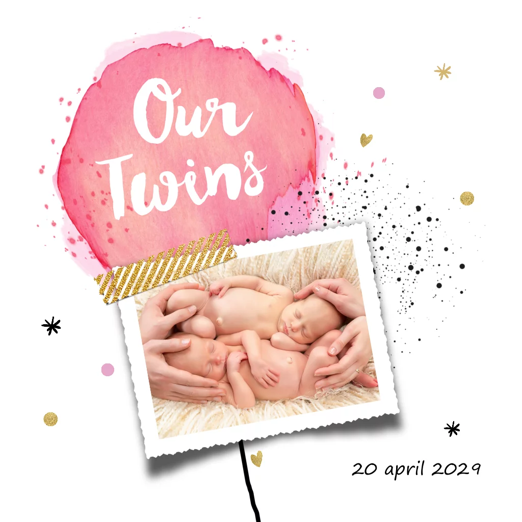 Geboortekaartje hip voor tweeling meisje met ruimte voor eigen foto en waterverf ballon.