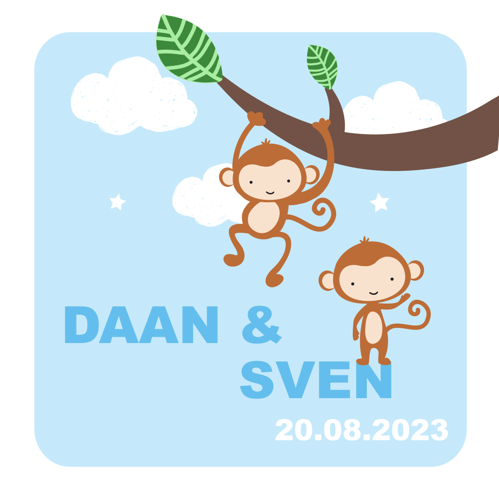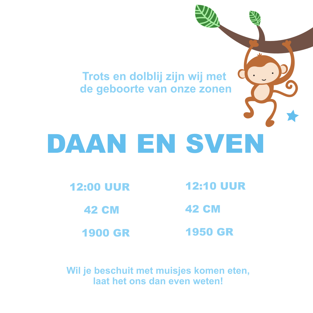 Bestel dit unieke tweelingkaartje met aapjes voor jullie zoontjes. Aan de binnenzijde van dit geboortekaartjes komen de apen op speelse wijze terug in het ontwerp.