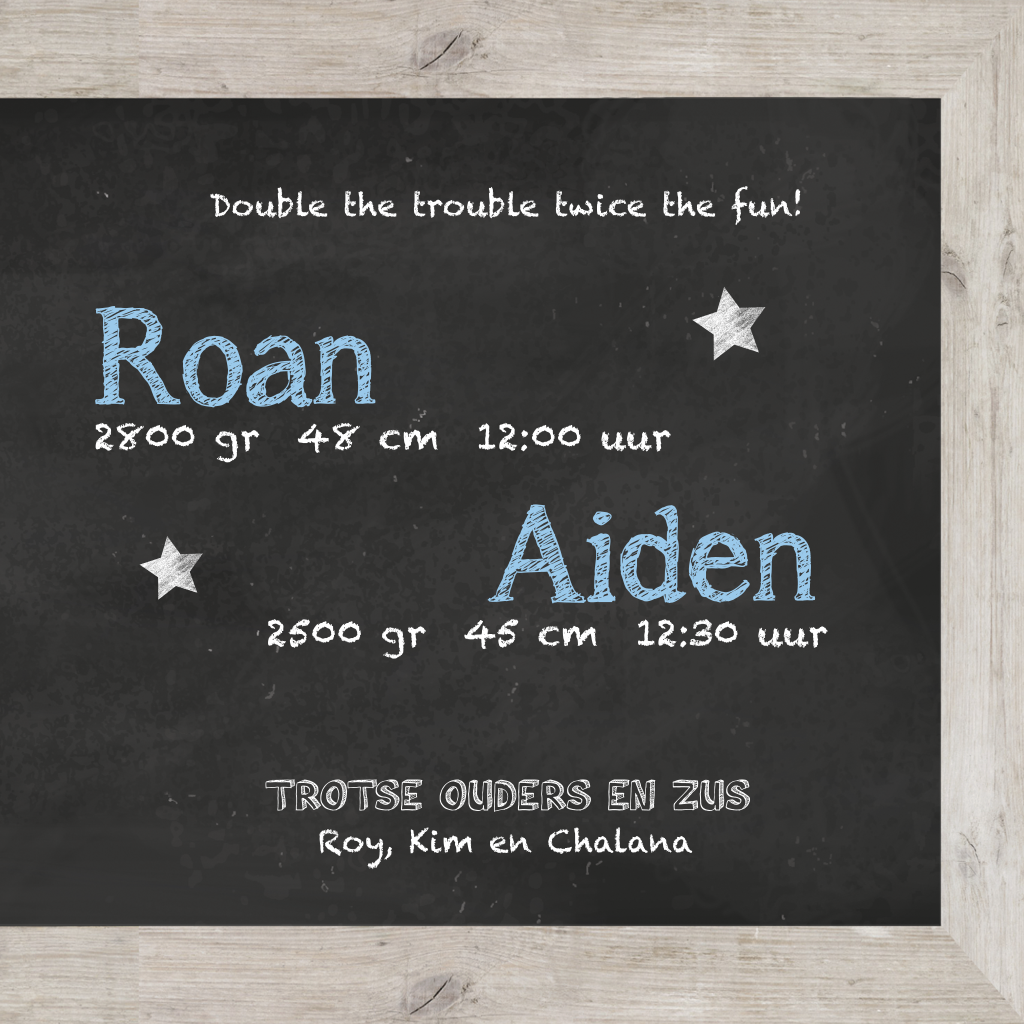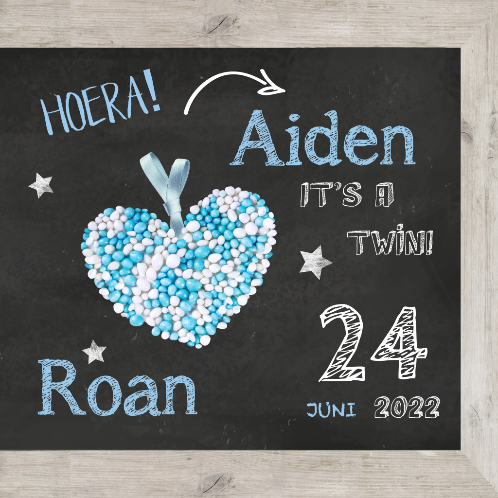 Stoer geboortekaartje voor jongens tweeling met krijtbord, hout en hart gemaakt van blauw witte muisjes. Tip: Op Oud Hollands papier komt dit kaartje extra goed tot zijn recht.
