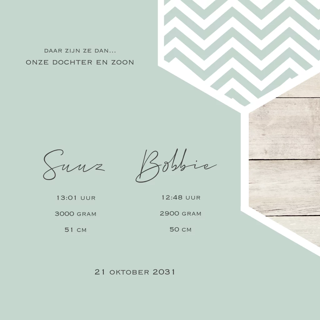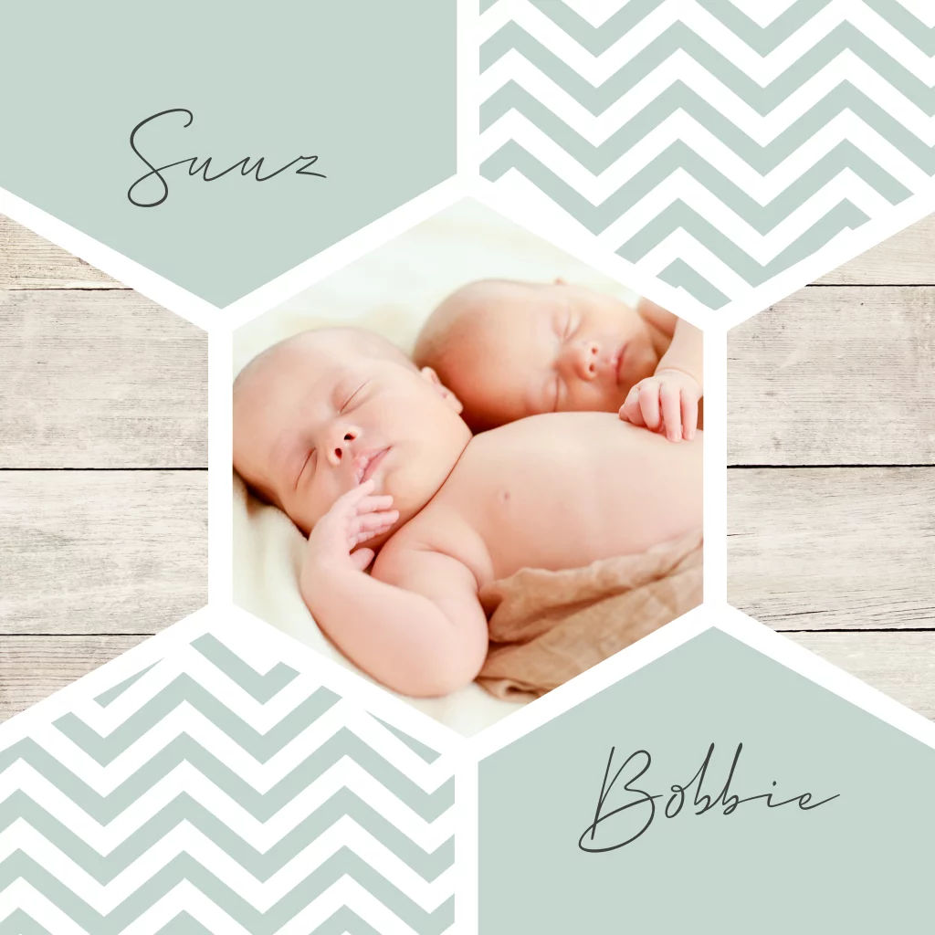 Lief babykaartje voor een tweeling broer zus met ruimte voor een eigen foto.