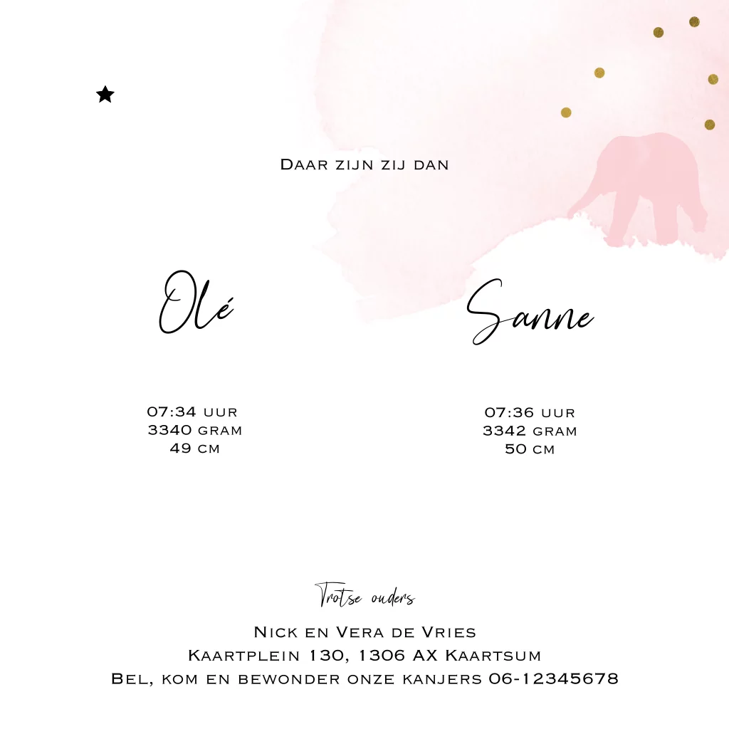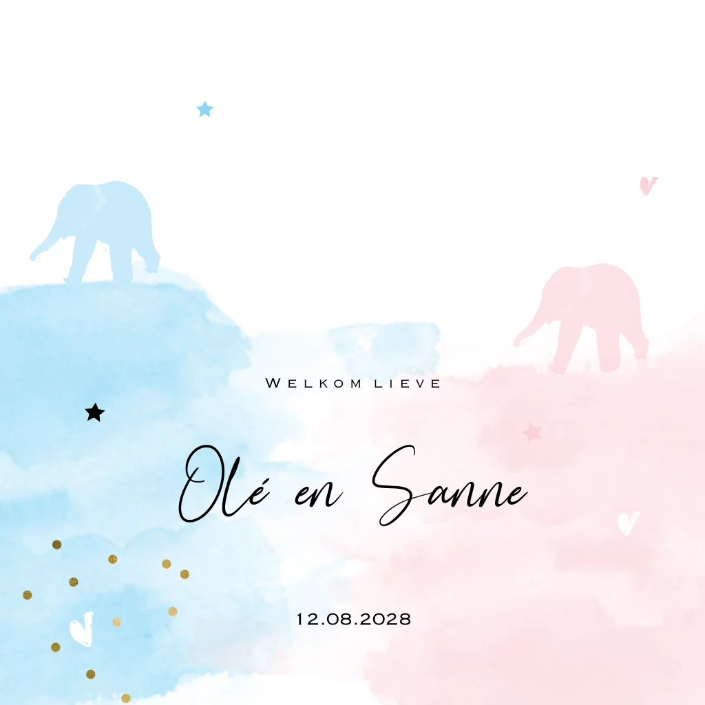 Lief tweeling geboortekaartje roze en blauwe olifant