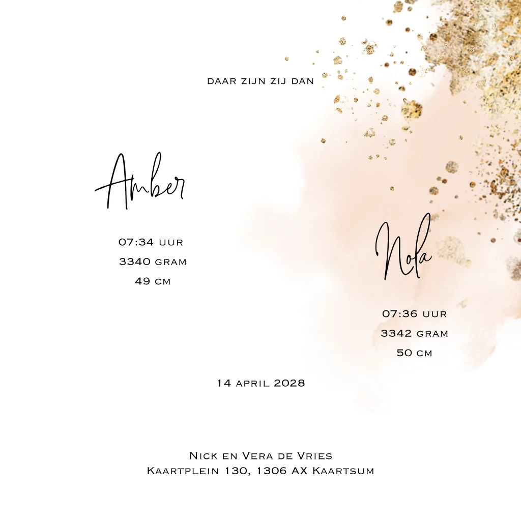 Hip geboortekaartje twins met roze watercolor en goudlook verf.