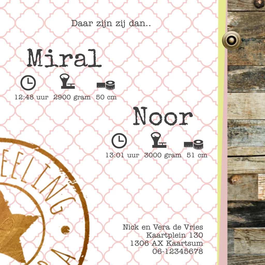 Meisjes tweeling geboortekaartje roze en hout look