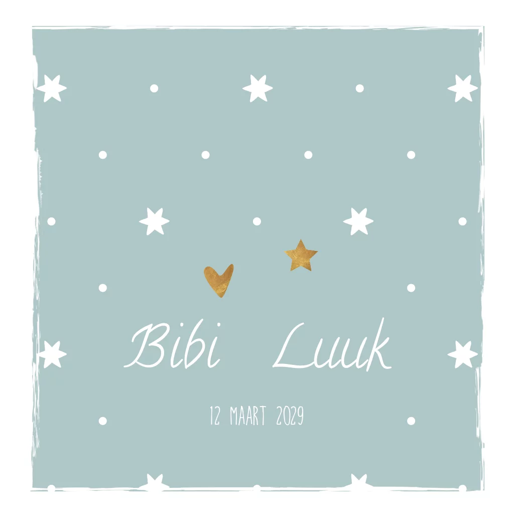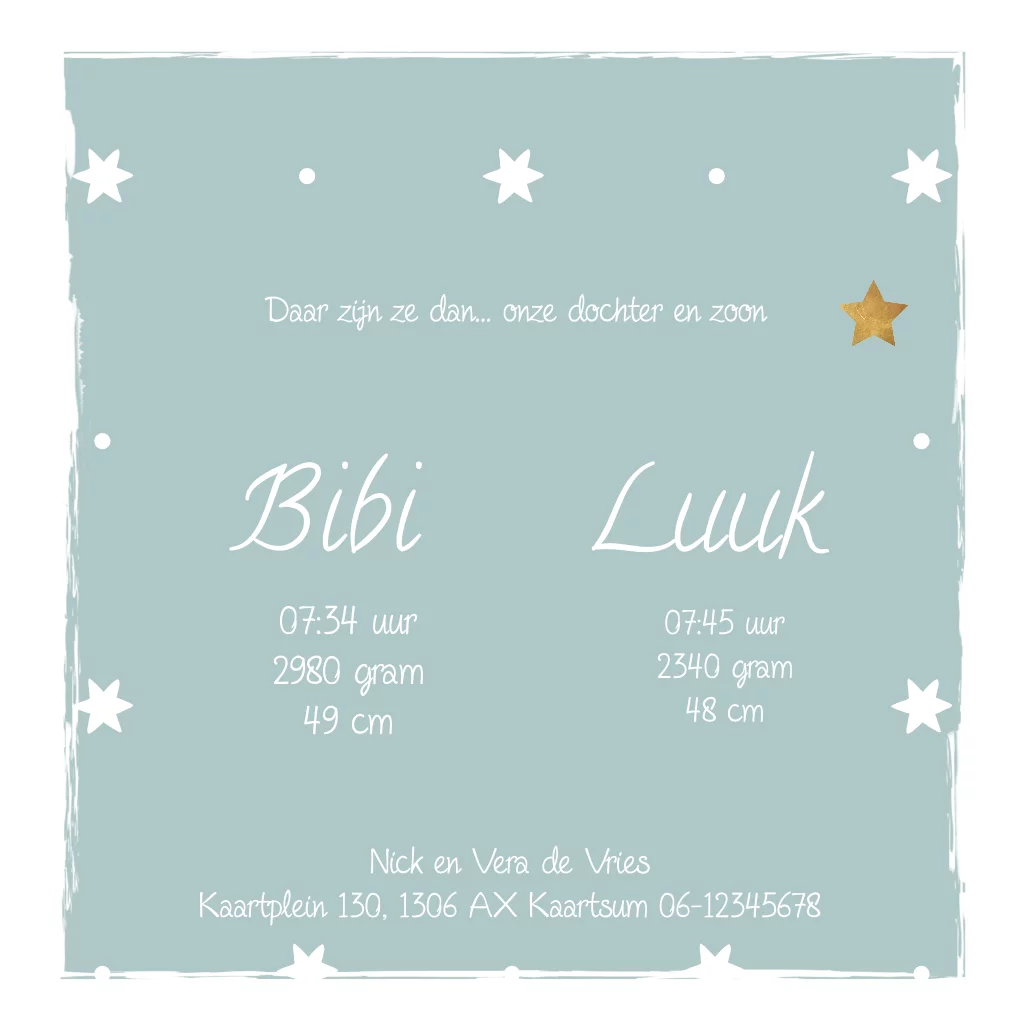 Lief geboortekaartje met mint groene achtergrond en witte sterretjes. Voor een jongen meisje tweeling.