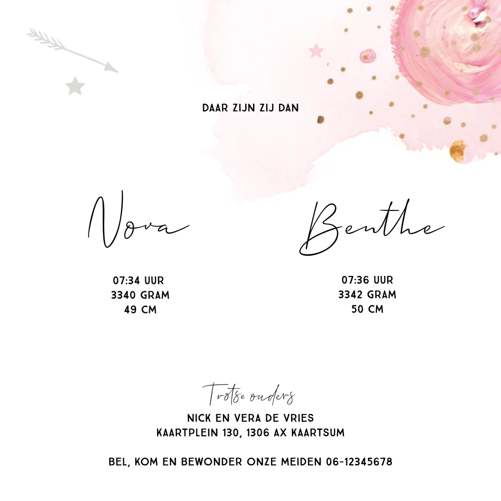 Modern roze waterverf geboortekaartje tweeling meisjes