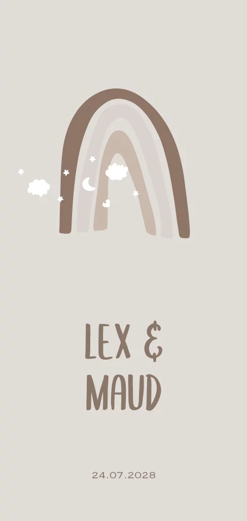 Regenboog babykaartje voor een jongetjes tweeling met warme aardetinten en regenboog.