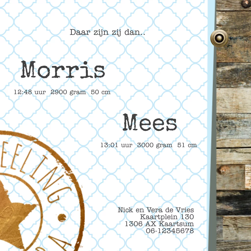 Tweeling geboortekaartje jongetjes stoer met hout look en stempel.
