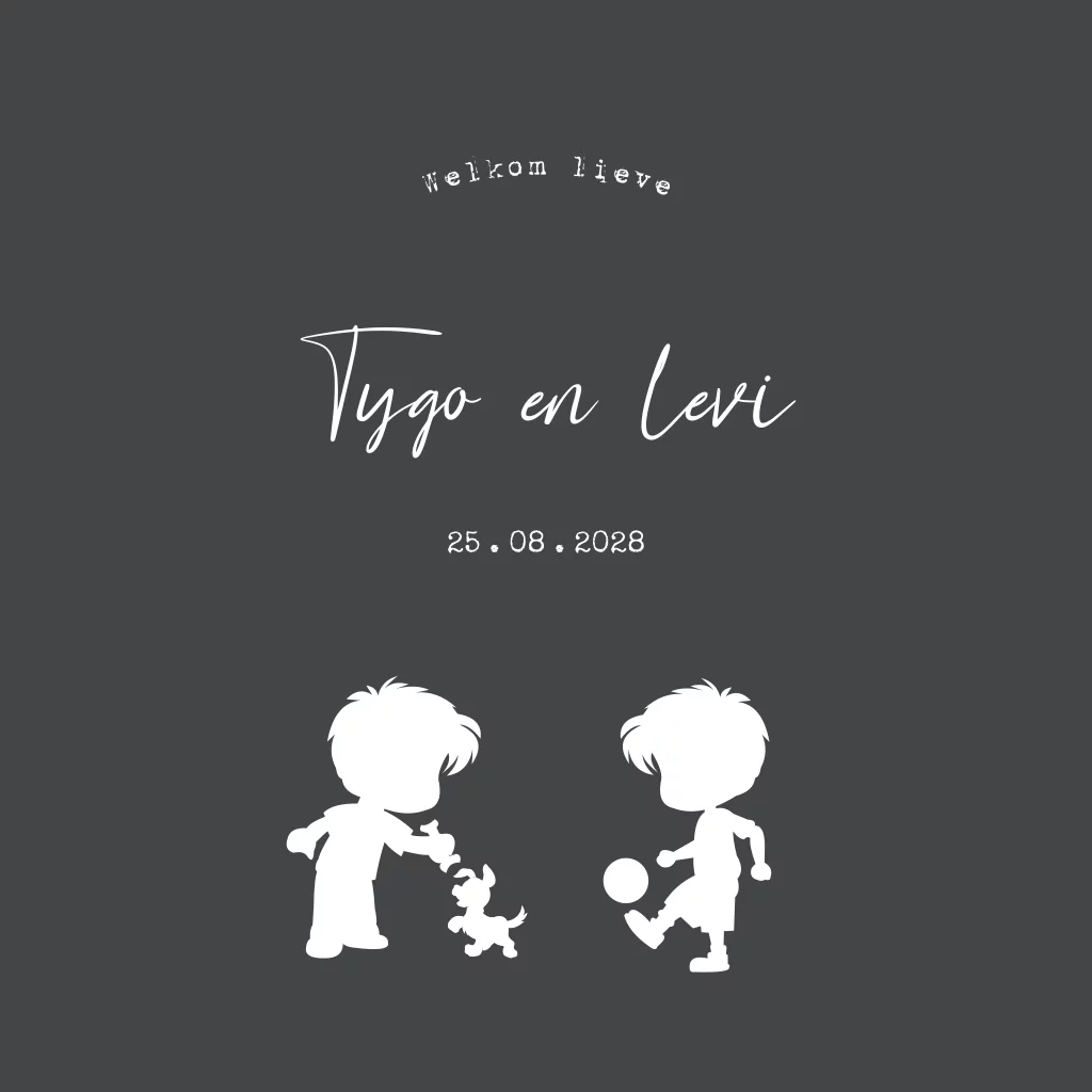 Stoer babykaartje jongens tweeling met voetbal en hondje.