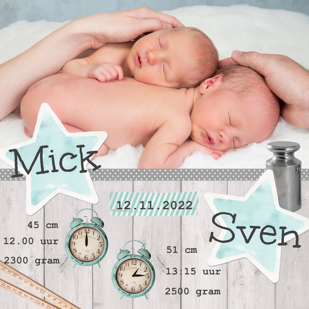 Hip of stoer, hoe zou jij dit tweelingkaartje voor jongens omschrijven? Mocht je hulp nodig hebben met het aanpassen van de geboortetijden op de wekkers, neem dan contact met ons op.