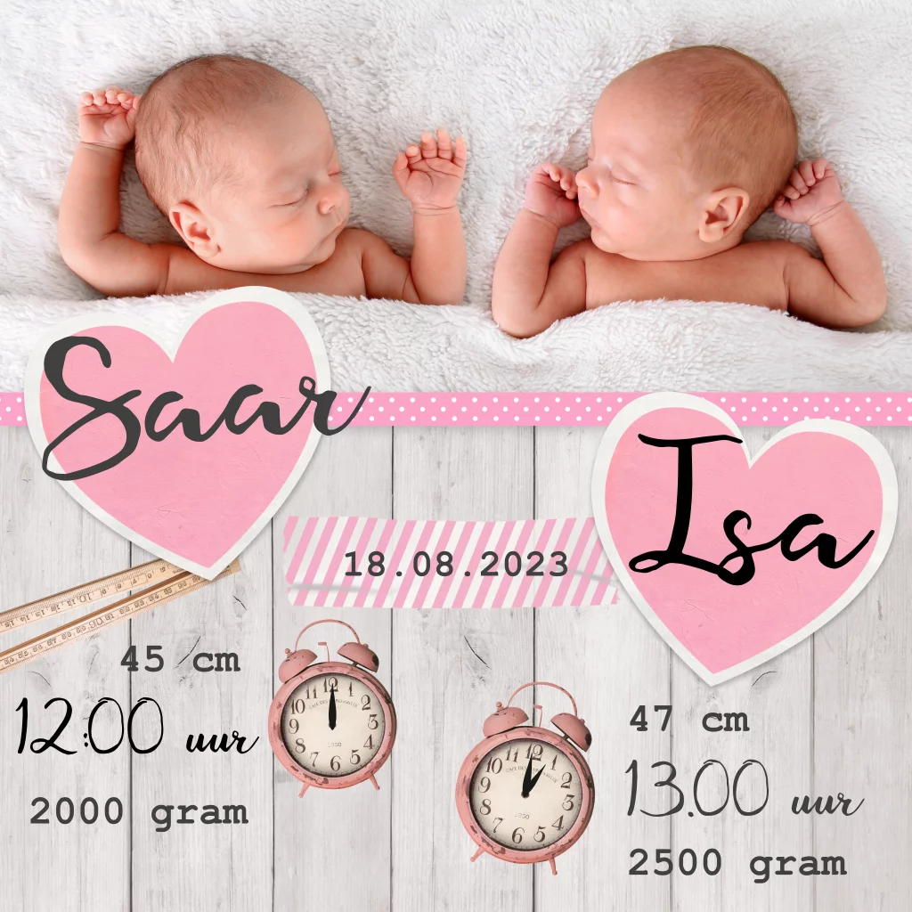 Stoer tweeling geboortekaartje - Roze hart en steigerhout
