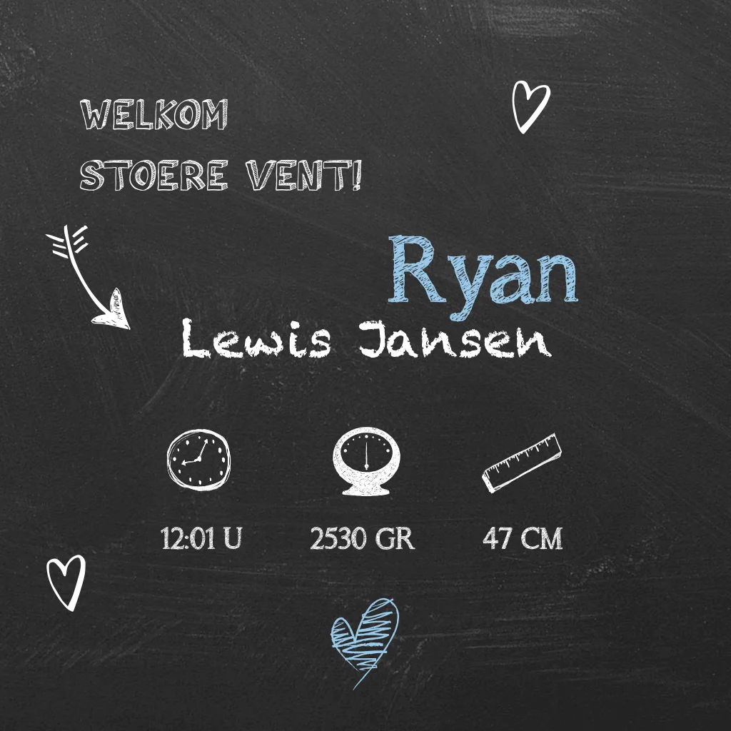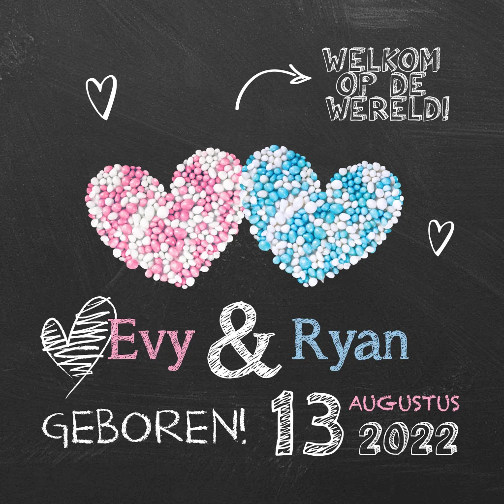 Stoer tweelingkaartje geboortekaartje met krijtbord en hartjes van roze en blauwe muisjes.