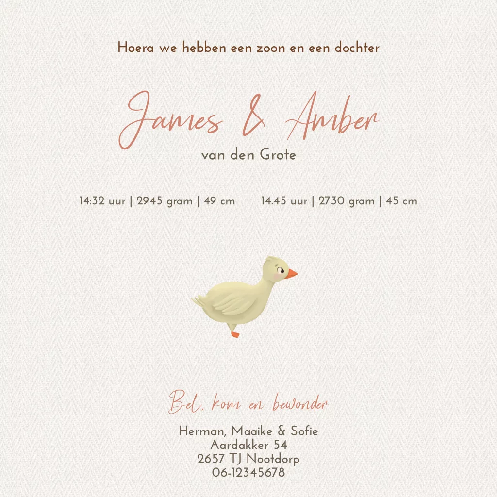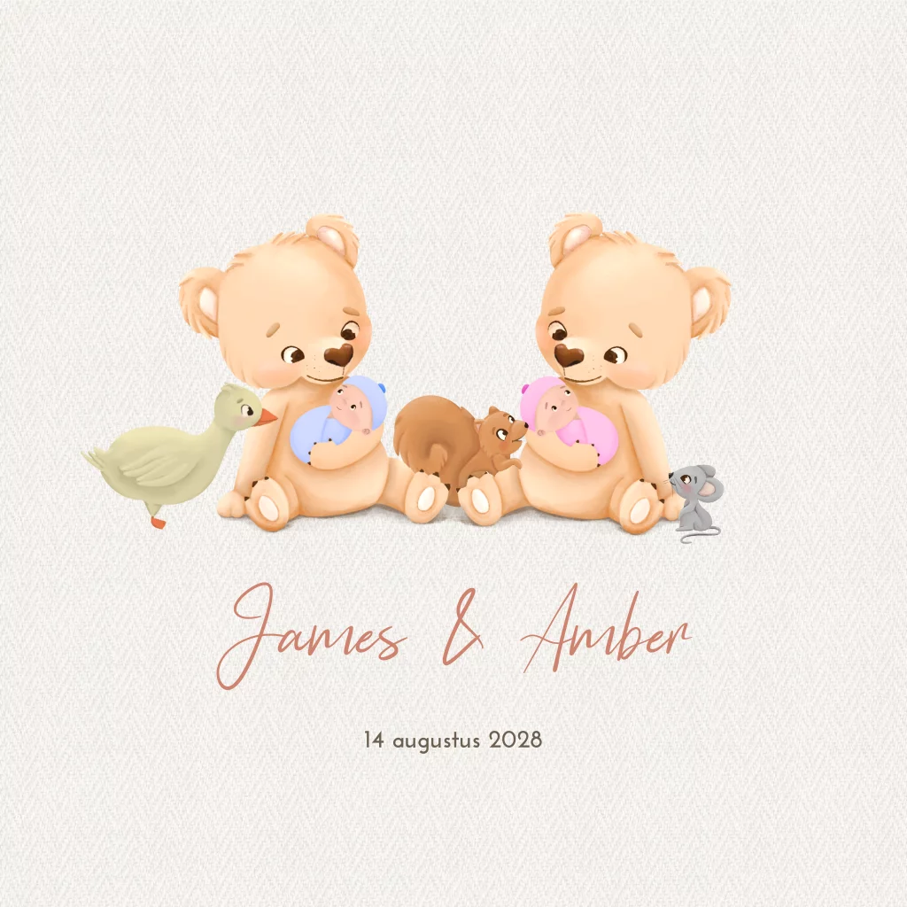 Tweeling geboortekaartje beertjes met bosdieren